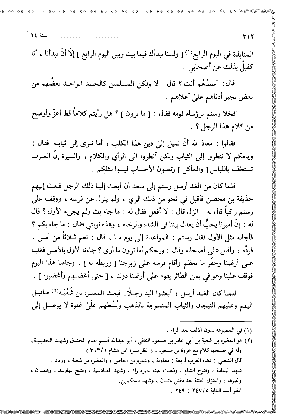 فلما كان الغد أرسل ابعثوا إلينا رجلا فبعث المغيرة بن شعبة فأقبل إليهم وعليهم التيجان والثياب المنسوجة بالذهب وبسطهم على غلوة لا يوصل إلى