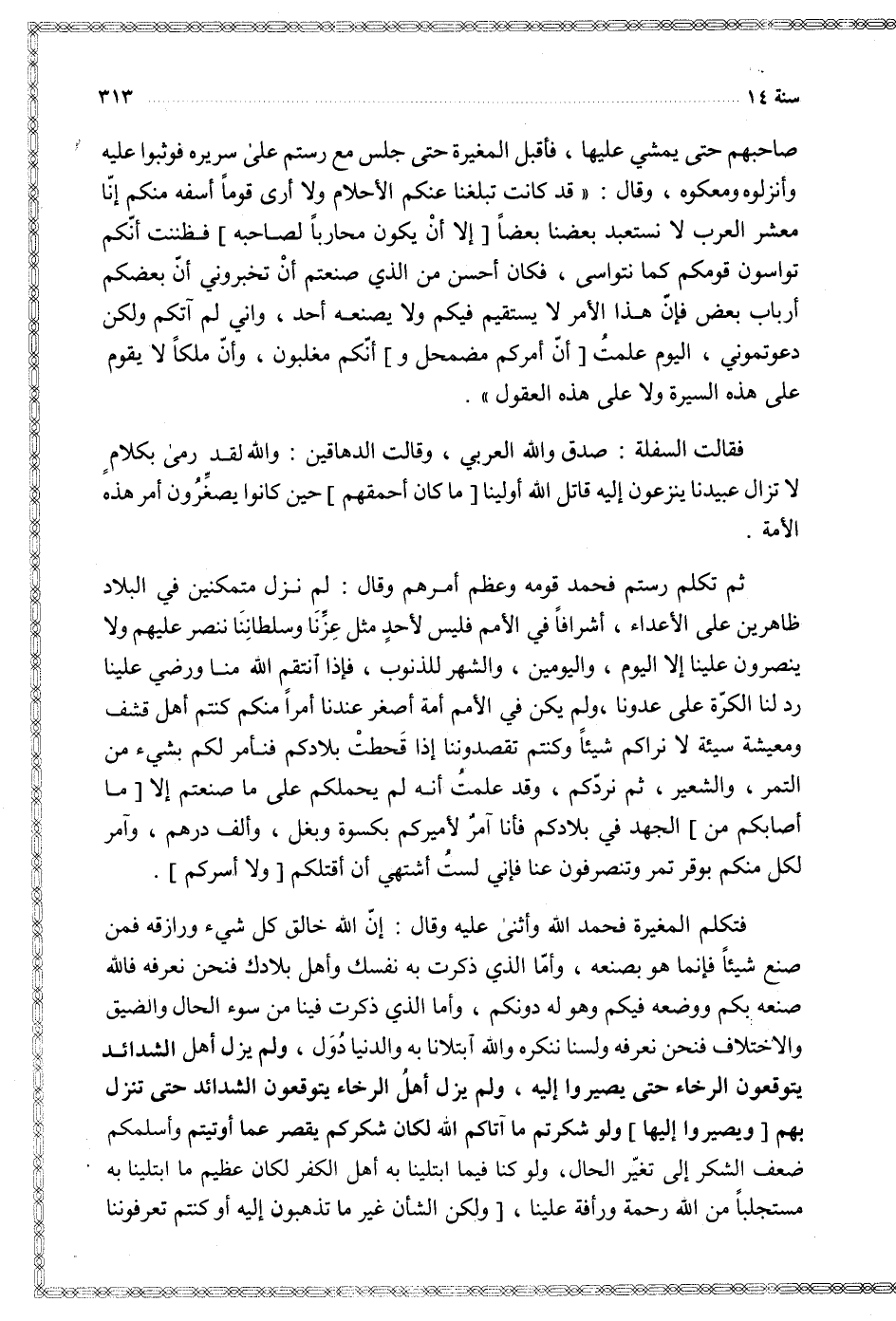 صاحبكم حتى يمشي عليها فأقبل المغيرة حتى جلس مع رستم على سريره فوثبوا عليه وأنزلوه ومعكوه وقال قد كانت تبلغنا عنكم الأحلام ولا أرى قوما اسفه منكم إنا معشر العرب لا نستعبد بعضنا بعضا إلا أن يكون محاربا لصاحبه فظننت أنكم تواسون قومكم كما نتواسى فكان أحسن من الذي صنعتم أن تخبروني أن بعضكم أرباب بعض فإن هذا الأمر لا يستقيم فيكم ولا يصنعه أحد وإني لم آتكم ولكن دعوتموني اليوم علمت أن أمركم مضمحل وأنكم مغلبون وأن ملكا لا يقوم على هذه السيرة ولا على هذه العقول