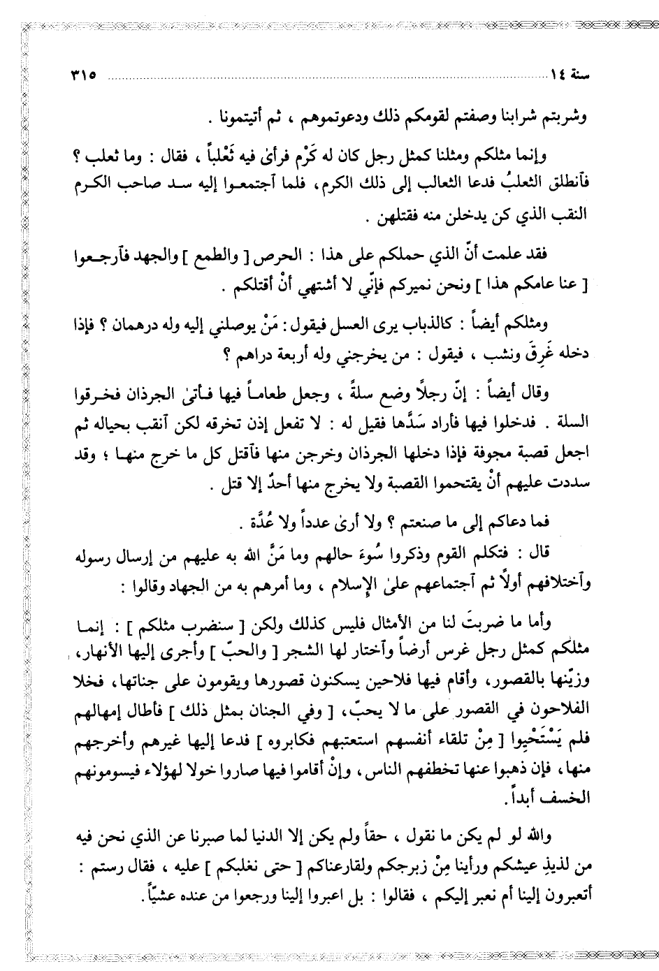 والله لو لم يكن ما نقول حقا ولم يكن إلا الدنيا لما صبرنا عن الذي نحن فيه من لذيذ عيشكم ورأينا من زبرجكم ولقارعناكم حتى نغلبكم عليه فقال رستم أتعبرون إلينا أم نعبر إليكم فقالوا بل اعبروا إلينا ورجعوا من عنده عشيا