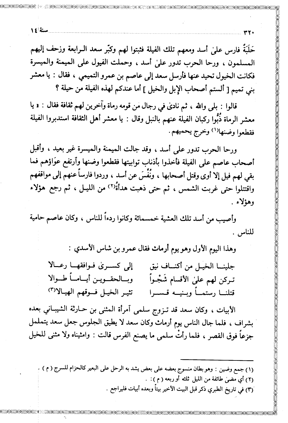 حلبة فارس على أسد ومعهم تلك الفيلة فثبتوا لهم وكبر سعد الرابعة وزحف إليهم المسلمون ورحا الحرب تدور على أسد وحملت الفيول على الميمنة والميسرة فكانت الخيول تحيد عنها فأرسل سعد إلى عاصم بن عمرو التميمي فقال يا معشر بني تميم ألستم أصحاب الإبل والخيل أما عندكم لهذه الفيلة من حيلة