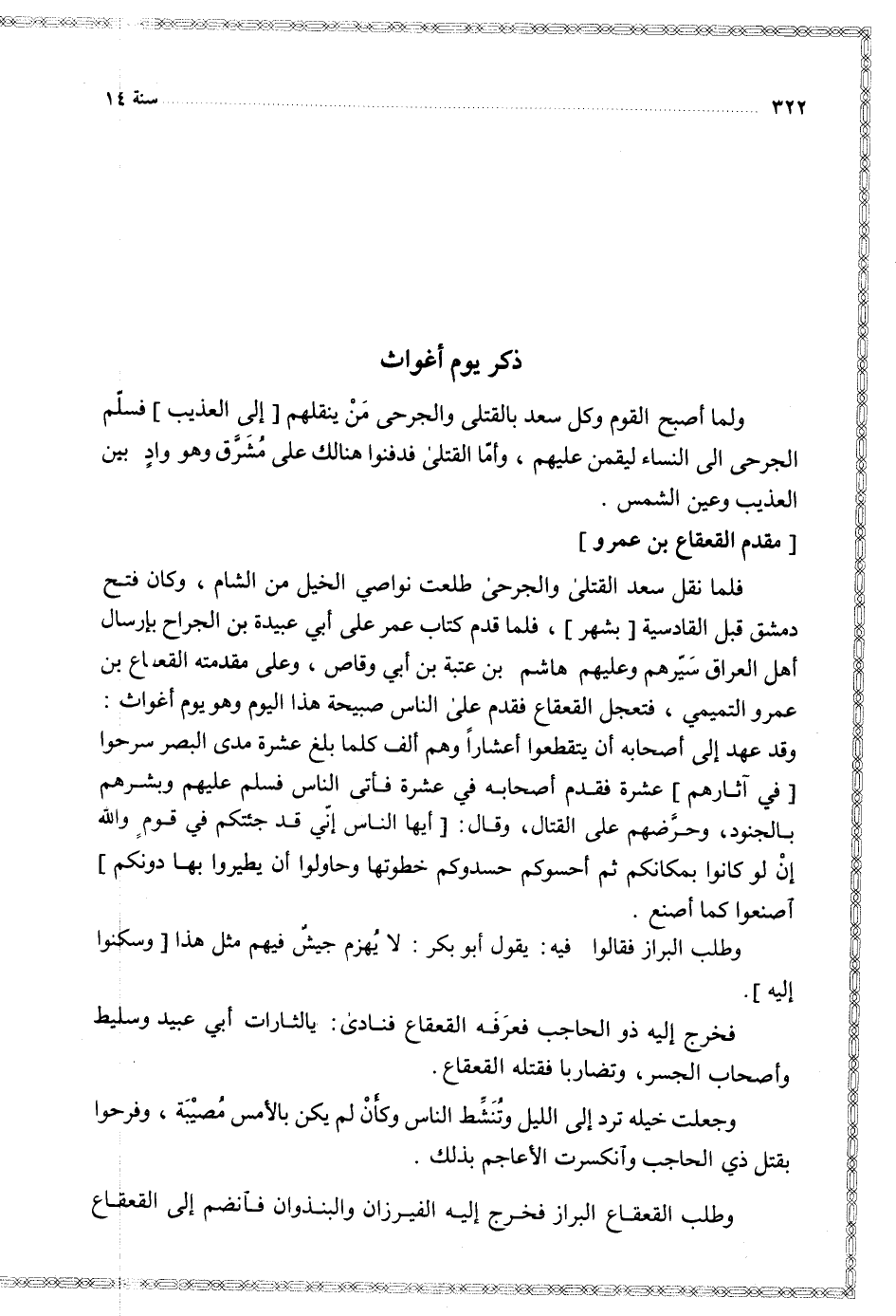 فلما نقل سعد القتلى والجرحى طلعت نواصي الخيل من الشام وكان فتح دمشق قبل القادسية بشهر فلما قدم كتاب عمر على أبي عبيدة بن الجراح بإرسال أهل العراق سيرهم وعليهم هاشم بن عتبة بن أبي وقاص وعلى مقدمته القعقاع بن عمرو التميمي فتعجل القعقاع فقدم على الناس صبيحة هذا اليوم وهو يوم أغواث وقد عهد إلى أصحابه أن يتقطعوا أعشارا وهم ألف كلما بلغ عشرة مدى البصر سرحوا في آثارهم عشرة فقدم أصحابه في عشرة فأتى الناس فسلم عليهم وبشرهم بالجنود وحرضهم على القتال وقال أيها الناس إني قد جئتكم في قوم والله إن لو كانوا بمكانكم ثم أحسوكم حسدوكم خطوتها وحاولوا أن يطيروا بها دونكم اصنعوا كما أصنع