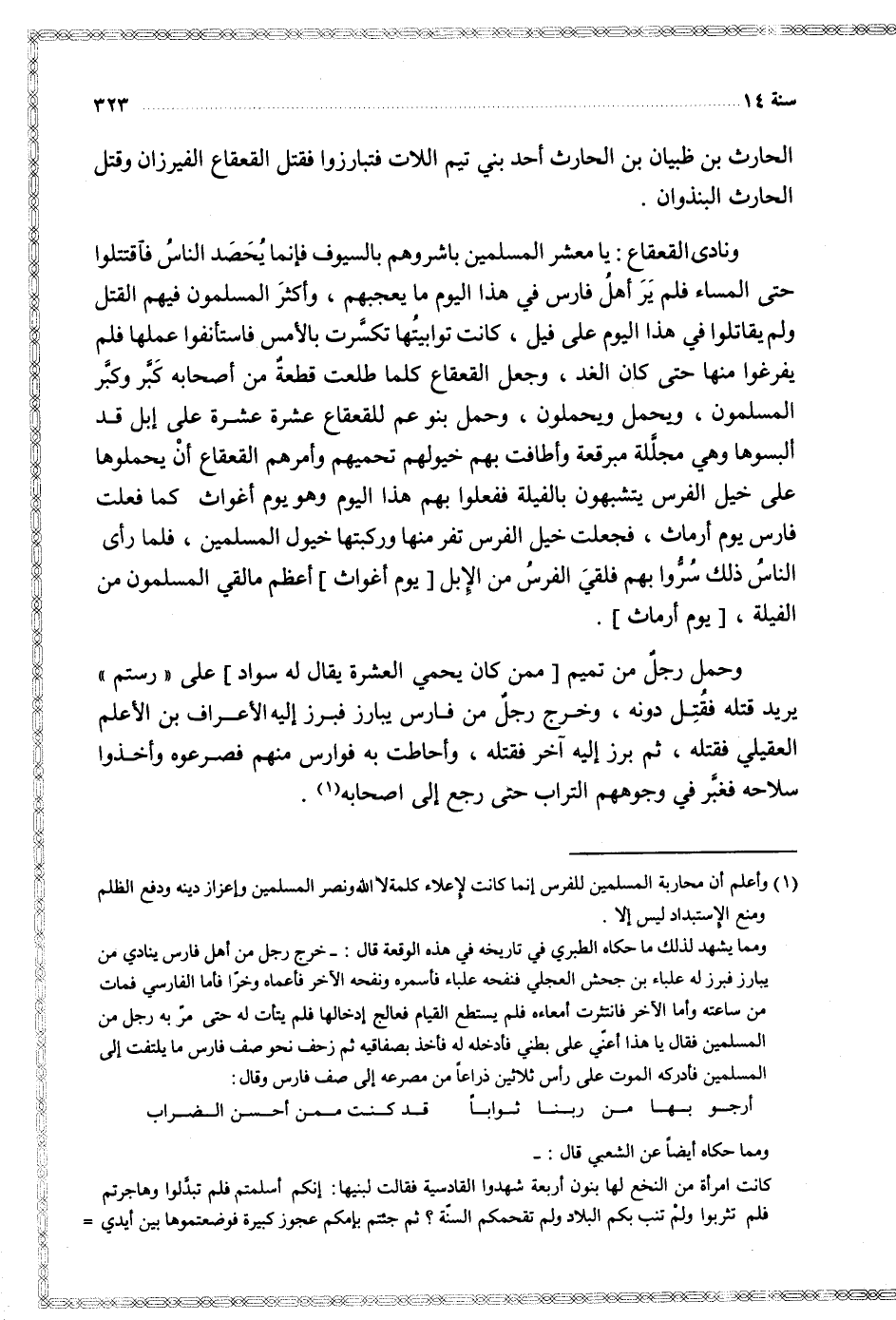 وحمل رجل من تميم ممن كان يحمي العشرة يقال لها سواد على رستم يريد قتله فقتل دونه وخرج رجل من فارس يبارز فبرز إليه الأعراف بن الأعلم العقيلي فقتله ثم برز إليه آخر فقتله وأحاطت بهم فوارس منهم فصرعوه وأخذوا سلاحه فغبر في وجوههم التراب حتى رجع إلى أصحابه
