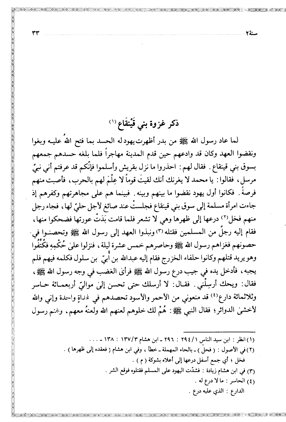 لما عاد رسول الله من بدر أظهرت يهود له الحسد بما فتح الله عليه وبغوا ونقضوا العهد وكان قد وادعهم حين قدم المدينة مهاجرا فلما بلغه حسدهم جمعهم بسوق بني قينقاع فقال لهم احذروا ما نزل بقريش وأسلموا فإنكم قد عرفتم أني نبي مرسل فقالوا يا محمد لا يغرنك أنك لقيت قوما لا علم لهم بالحرب فأصبت منهم فرصة فكانوا أول يهود نقضوا ما بينهم وبينه فبينما هم على مجاهرتهم وكفرهم إذ جاءت امرأة مسلمة إلى سوق بني قينقاع فجلست عند صائغ لأجل حلي لها فجاء رجل منهم فخل درعها إلى ظهرها وهي لا تشعر فلما قامت بدت عورتها فضحكوا منها فقال إليه رجل من المسلمين فقتله ونبذوا العهد إلى رسول الله وحاصرهم خمس عشرة ليلة فنزلوا على حكمه فكتفوا وهو يريد قتلهم وكانوا حلفاء الخزرج فقال إليه عبد الله بن أبي بن سلول فكلمه فيهم فلم يجبه فأدخل يده في جيب درع رسول الله فرأى الغضب في وجه رسول الله فقال ويحك أرسلني فقال لا أرسلك حتى تحسن إلى موالي أربعمائة حاسر وثلاثمائة دارع قد منعوني من الأحمر والأسود تحصدهم في غداة واحدة وإني والله لأخشى الدوائر فقال النبي هم لك خلوهم لعنهم الله ولعنه معهم وغنم رسول