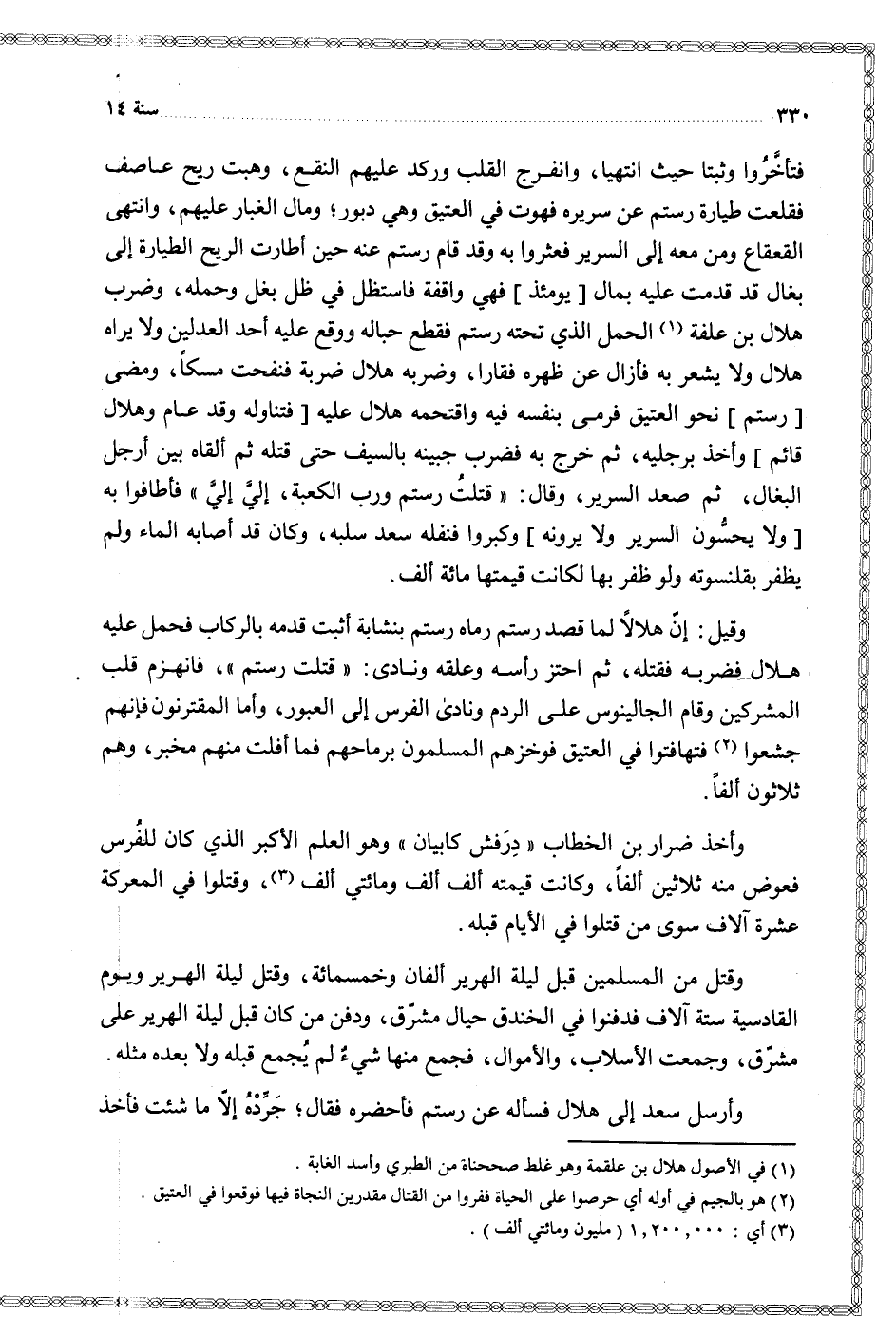 فتأخروا وثبتا حيث انتهيا وانفرج القلب وركد عليهم النقع وهبت ريح عاصف فقلعت طيارة رستم عن سريره فهوت في العتيق وهي دبور ومال الغبار عليهم وانتهى القعقاع ومن معه إلى السرير فعثروا به وقد قام رستم عنه حين أطارت الريح الطيارة إلى بغلا قد قدمت عليه بمال يومئذ فهي واقفة فاستظل في ظل بغل وحمله وضرب هلال بن علفة الحمل الذي تحته رستم فقطع حباله ووقع عليه أحد العدلين ولا يراه هلال ولا يشعر به فأزال عن ظهره فقارا وضربه هلال ضربة فنفحت مسكا ومضى رستم نحو العتيق فرمى بنفسه فيه واقتحمه هلال عليه فتناوله وقد عام وهلال قائم وأخذ برجليه ثم خرج به فضرب جبينه بالسيف حتى قتله ثم ألقاه بين أرجل البغال ثم صعد السرير وقال قتلت رستم ورب الكعبة إلي إلي فأطافوا به ولا يحسون السرير ولا يرونه وكبروا فنفله سعد سلبه وكان قد أصابه الماء ولم يظفر بقلنسوته ولو ظفر بها لكانت قيمتها مائة ألف