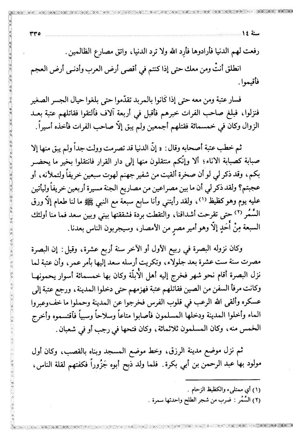 وكان نزوله البصرة في ربيع الأول أو الآخر سنة أربع عشرة وقيل إن البصرة مصرت سنة ست عشرة بعد جلولاء وتكريت أرسله سعد إليها بأمر عمر وأن عتبة لما نزل البصرة أقام نحو شهر فخرج إليه أهل الأبلة وكان بها خمسمائة أسوار يحمونها وكانت مرفأ السفن من الصين فقاتلهم عتبة فهزمهم حتى دخلوا المدينة ورجع عتبة إلى عسكره وألقى الله الرعب في قلوب الفرس فخرجوا عن المدينة وحملوا ما خف وعبروا الماء وأخلوا المدينة ودخلها المسلمون فأصابوا متاعا وسلاحا وسبيا فاقتسموه وأخرج الخمس منه وكان المسلمون ثلاثمائة وكان فتحها في رجب أو في شعبان