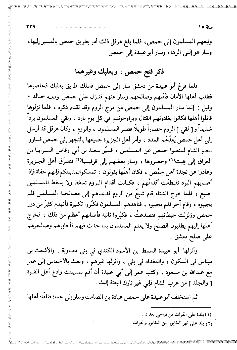وتبعهم المسلمون إلى حمص فلما بلغ هرقل ذلك أمر بطريق حمص بالمسير إليها وسار هو إلى الرها وسار أبو عبيدة إلى حمص