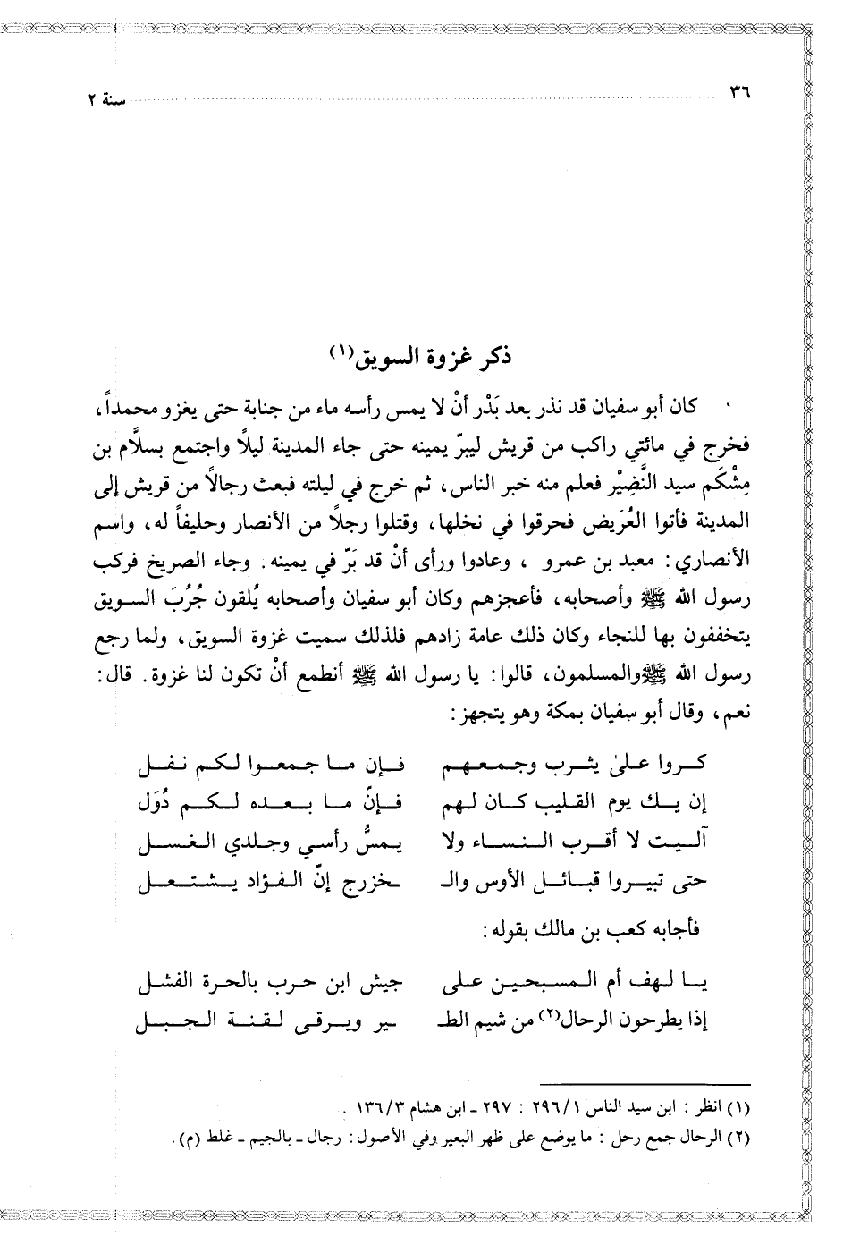 كان أبو سفيان قد نذر بعد بدر أن لا يمس رأسه ماء من جنابة حتى يغزو محمدا فخرج في مائتي راكب من قريش ليبر يمينه حتى جاء المدينة ليلا واجتمع بسلام بن مشكم سيد النضير فعلم منه خبر الناس ثم خرج في ليلته فبعث رجالا من قريش إلى المدينة فأتوا العريض فحرقوا في نخلها وقتلوا رجلا من الأنصار وحليفا له واسم الأنصاري معبد بن عمرو وعادوا ورأى أن قد بر في يمينه وجاء الصريخ فركب رسول الله وأصحابه فأعجزهم وكان أبو سفيان وأصحابه يلقون جرب السويق يتخفون بها للنجاء وكان ذلك عامة زادهم فلذلك سميت غزوة السويق ولما رجع رسول الله والمسلمون قالوا يا رسول الله أنطمع أن تكون لنا غزوة قال نعم وقال أبو سفيان بمكة وهو يتجهز