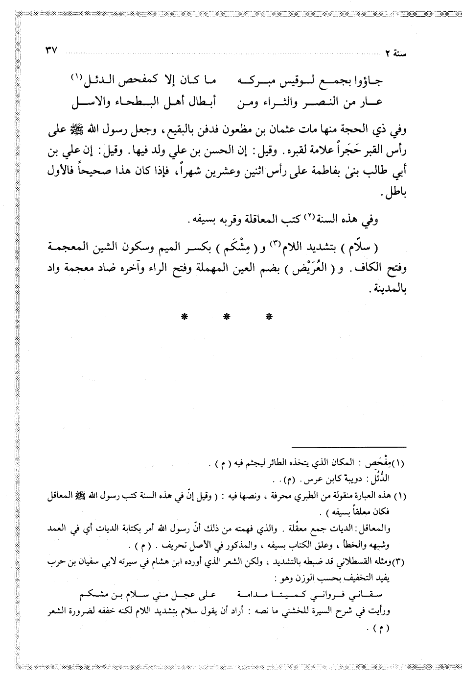 وفي ذي الحجة منها مات عثمان بن مظعون فدفن بالبقيع وجعل رسول الله على رأس القبر حجرا علامة لقبره وقيل إن الحسن بن علي ولد فيها وقيل إن علي بن أبي طالب بنى بفاطمة على رأس اثنين وعشرين شهرا فإذا كان هذا صحيحا فالأول باطل