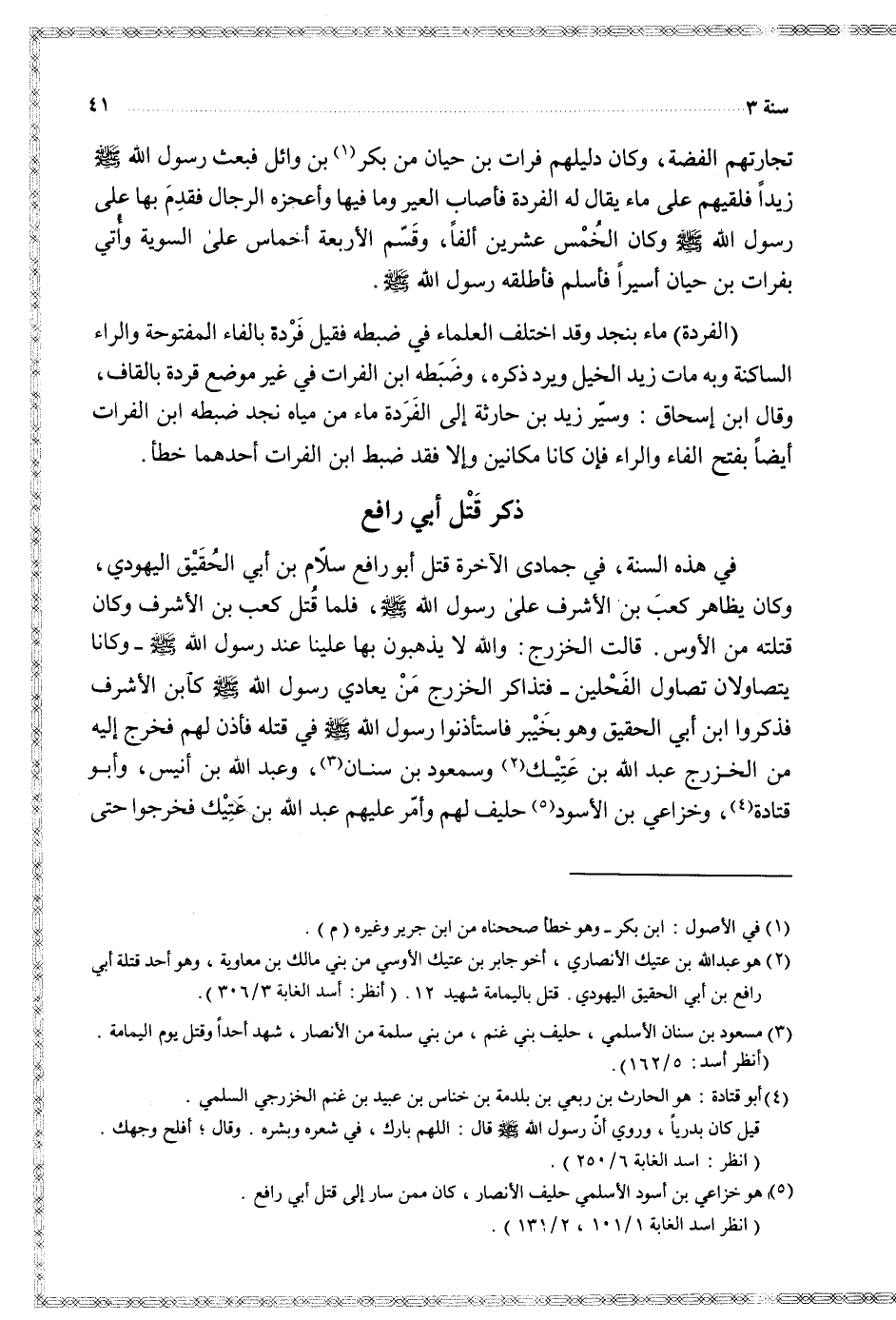 في هذه السنة في جمادى الآخرة قتل أبو رافع سلام بن أبي الحقيق اليهودي وكان يظاهر كعب بن الأشرف على رسول الله فلما قتل كعب بن الأشرف وكان قتلته من الأوس قالت الخزرج والله لا يذهبون بها علينا عند رسول الله وكانا يتصاولان تصاول الفحلين فتذاكر الخزرج من يعادي رسول الله كابن الأشرف فذكروا ابن أبي الحقيق وهو بخيبر فاستأذنوا رسول الله في قتله فأذن لهم فخرج إليه من الخزرج عبد الله بن عتيك ومسعود بن سنان وعبد الله بن أنيس وأبو قتادة وخزاعي بن الأسود حليف لهم وأمر عليهم عبد الله بن عتيك فخرجوا حتى