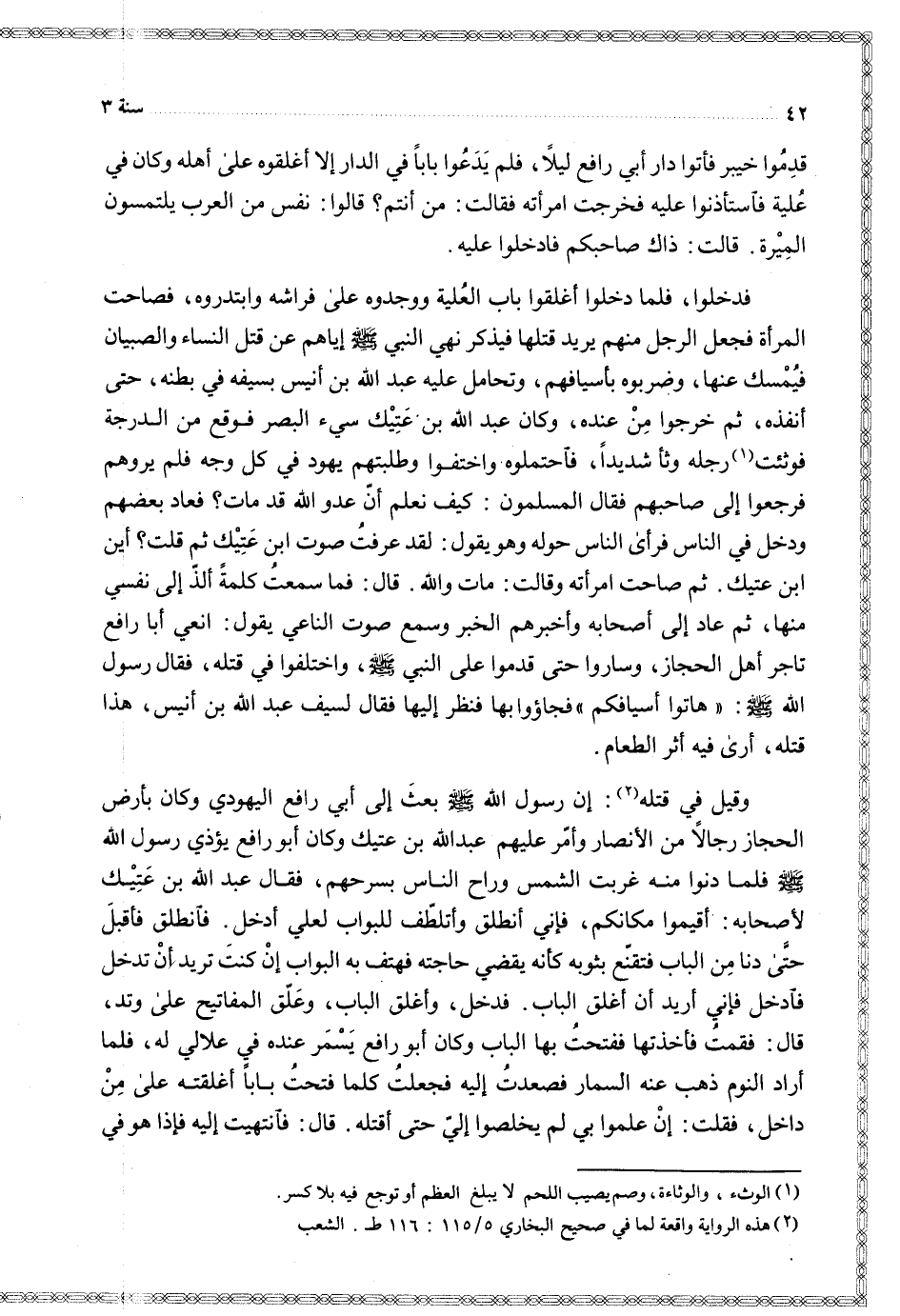 فدخلوا فلما دخلوا أغلقوا باب العلية ووجدوه على فراشه وابتدروه فصاحت المرأة فجعل الرجل منهم يريد قتلها فيذكر نهي النبي إياهم عن قتل النساء والصبيان فيمسك عنها وضربوه بأسيافهم وتحامل عليه عبد الله بن أنيس بسيفه في بطنه حتى أنفذه ثم خرجوا من عنده وكان عبد الله بن عتيك سيئ البصر فوقع من الدرجة فوثئت رجله وثأ شديدا فاحتملوه واختفوا وطلبتهم يهود في كل وجه فلم يروهم فرجعوا إلى صاحبهم فقال المسلمون كيف نعلم أن عدو الله قد مات فعاد بعضهم ودخل في الناس فرأى الناس حوله وهو يقول لقد عرفت صوت ابن عتيك ثم قلت أين ابن عتيك ثم صاحت امرأته وقالت مات والله قال فما سمعت كلمة ألذ إلى نفسي منها ثم عاد إلى أصحابه وأخبرهم الخبر وسمع صوت الناعي يقول أنعي أبا رافع تاجر أهل الحجاز وساروا حتى قدموا على النبي واختلفوا في قتله فقال رسول الله (هاتوا أسيافكم) فجاؤوا بها فنظر إليها فقال لسيف عبد الله بن أنيس هذا قتله أرى فيه أثر الطعام