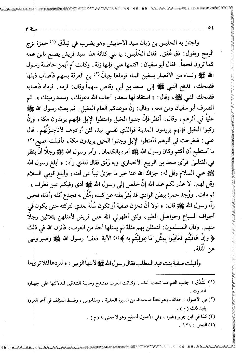 واجتاز به الحليس بن زبان سيد الأحابيش وهو يضرب في شدق حمزة بزج الرمح ويقول ذق عقق فقال الحليس يا بني كنانة هذا سيد قريش يصنع بابن عمه كما ترون لحما فقال أبو سفيان اكتمها عني فإنها زلة وكانت أم أيمن حاضنة ونساء من الأنصار يسقين الماء فرماها حبان بن العرقة بسهم فأصاب ذيلها فضحك فدفع النبي إلى سعد بن أبي وقاص سهما وقال ارمه فرماه فأصابه فضحك النبي وقال استقاد لها سعد أجاب الله دعوتك وسدد رميتك ثم انصرف أبو سفيان ومن معه وقال إن موعدكم العام المقبل ثم بعث رسول الله عليا في أثرهم وقال انظر فإن جنبوا الخيل وامتطوا الإبل فإنهم يريدون مكة وإن ركبوا الخيل فإنهم يريدون المدينة فوالذي نفسي بيده لئن أرادوها لأناجزنهم قال علي فخرجت في أثرهم فامتطوا الإبل وجنبوا الخيل يريدون مكة فأقبلت أصيح ما أستطيع أن اكتم وكان رسول الله أمره بالكتمان وأمر رسول الله رجلا أن ينظر في القتلى فرأى سعد بن الربيع الأنصاري وبه رمق فقال للذي رآه أبلغ رسول الله عني السلام وقل له جزاك الله عنا خير ما جزى نبيا عن أمته وأبلغ قومي السلام وقل لهم لا عذر لكم عند الله إن خلص إلى رسول الله أذى وفيكم عين تطرف ثم مات ووجد حمزة ببطن الوادي قد بقر بطنه عن كبده ومثل به فجذع أنفه وأذناه فحين رآه رسول الله قال لولا أن تحزن صفية أو تكون سنة بعدي لتركته حتى يكون في أجواف السبع وحواصل الطير ولئن أظهرني الله على قريش لأمثلن بثلاثين رجلا منهم وقال المسلمون لنمثلن بهم مثلة لم يمثلها أحد من العرب فأنزل الله في ذلك { وإن عاقبتم فعاقبوا بمثل ما عوقبتم به } الآية فعفا رسول الله وصبر ونهى عن المثلة