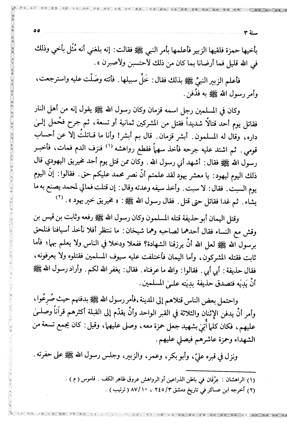 وكان في المسلمين رجل اسمه قزمان وكان رسول الله يقول أنه من أهل النار فقاتل يوم أحد قتالا شديدا فقتل من المشركين ثمانية أو تسعة ثم جرح فحمل إلى داره وقال له المسلمون أبشر قزمان قال بما أبشر وأنا ما قاتلت إلا عن أحساب قومي ثم اشتد عليه جرحه فأخذ سهما فقطع رواهشه فنزف الدم فمات فأخبر رسول الله فقال أشهد أني رسول الله وكان ممن قتل يوم أحد مخيريق اليهودي قال ذلك اليوم ليهود يا معشر يهود لقد علمتم أن نصر محمد عليكم حق فقالوا إن اليوم يوم السبت فقال لا سبت وأخذ سيفه وعدته وقال إن قتلت فمالي لمحمد يصنع به ما يشاء ثم غدا فقاتل حتى قتل فقال رسول الله ( مخيريق خير يهود )