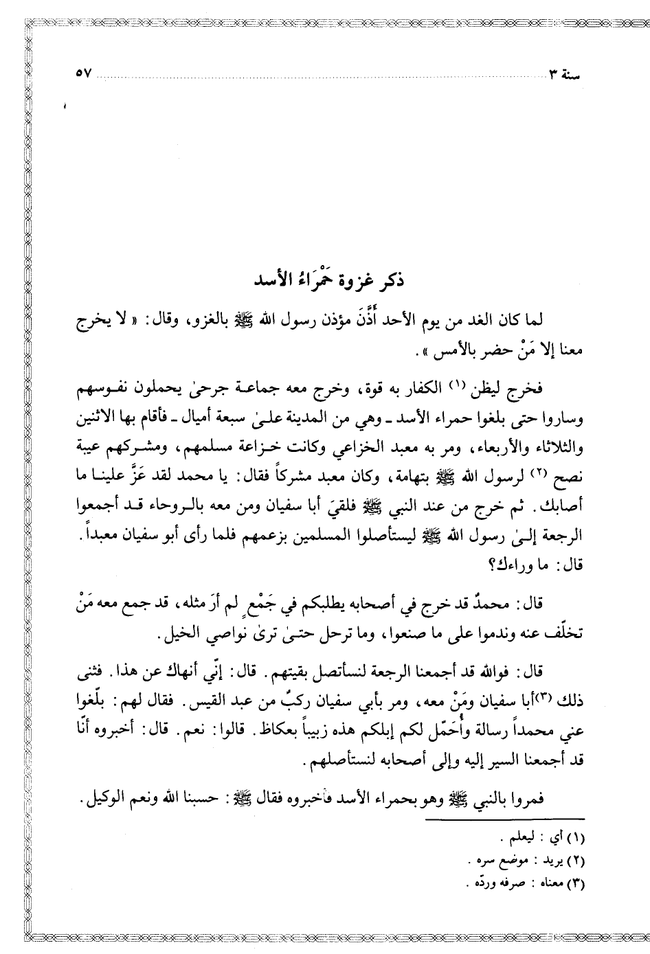 فيخرج ليظن الكفار به قوة وخرج معه جماعة جرحى يحملون نفوسهم وساروا حتى بلغوا حمراء الأسد وهي من المدينة على سبعة أميال فأقام بها الاثنين والثلاثاء والأربعاء ومر به معبد الخزاعي وكانت خزاعة مسلمهم ومشركهم عيبة نصح لرسول الله بتهامة وكان معبد مشركا فقال يا محمد لقد عز علينا ما أصابك ثم خرج من عند النبي فلقي أبا سفيان ومن معه بالروحاء قد أجمعوا الرجعة إلى رسول الله ليستأصلوا المسلمين بزعمهم فلما رأى أبو سفيان معبدا قال ما وراءك