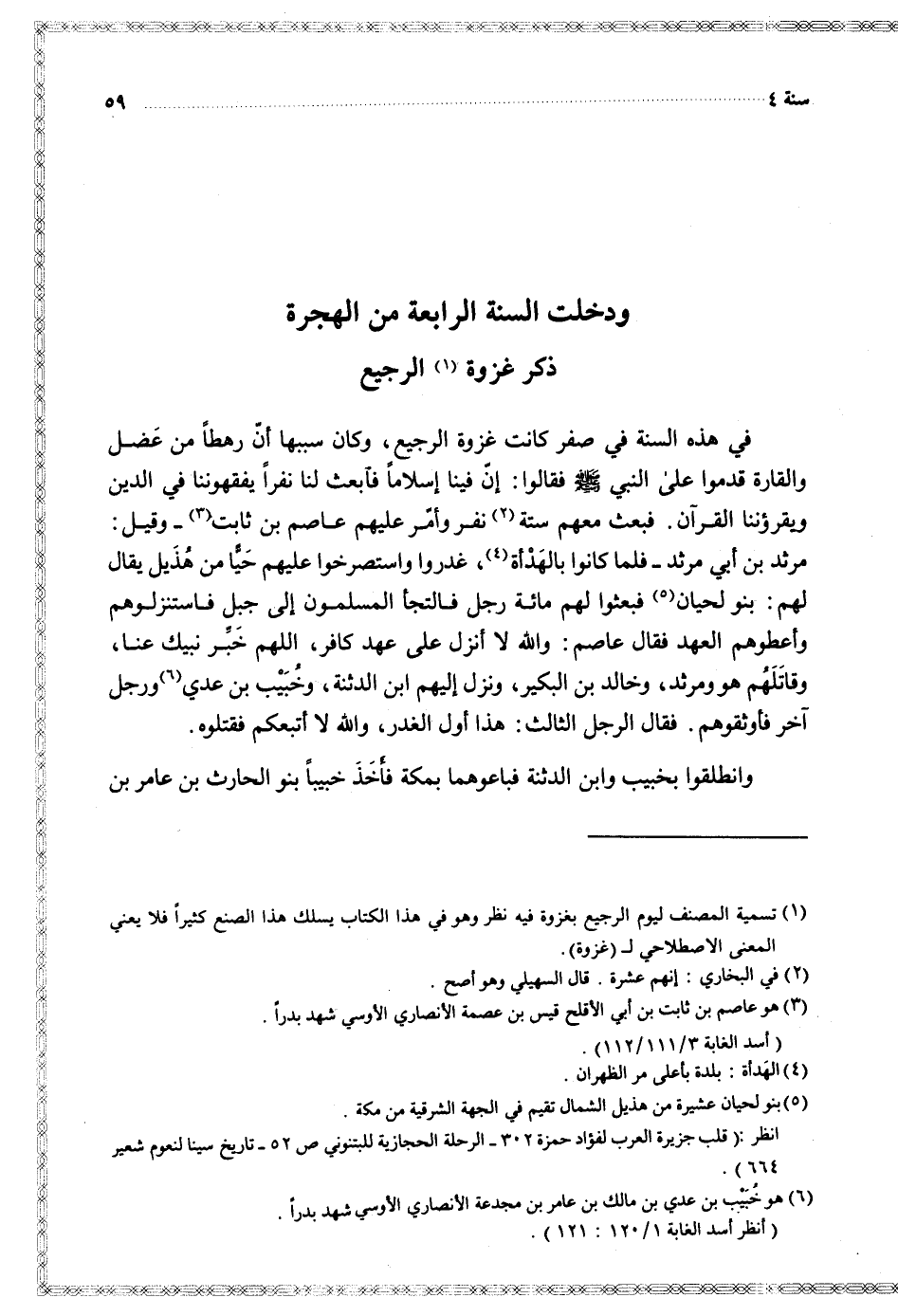 في هذه السنة في صفر كانت غزوة الرجيع وكان سببها أن رهطا من عضل والقارة قدموا على النبي فقالوا إن فينا إسلاما فابعث لنا نفرا يفقهوننا في الدين ويقرؤننا القرآن فبعث معهم ستة نفر وأمر عليهم عاصم بن ثابت وقيل مرثد بن أبي مرثد فلما كانوا بالهدأة غدروا واستصرخوا عليهم حيا من هذيل يقال لهم بنو لحيان فبعثوا لهم مائة رجل فالتجأ المسلمون إلى جبل فاستنزلوهم وأعطوهم العهد فقال عاصم والله لا انزل على عهد كافر اللهم خبر نبيك عنا وقاتلهم هو ومرثد وخالد بن البكير ونزل إليهم ابن الدثنة وخبيب بن عدي ورجل آخر فأوثقوهم فقال الرجل الثالث هذا أول الغدر والله لا اتبعكم فقتلوه
