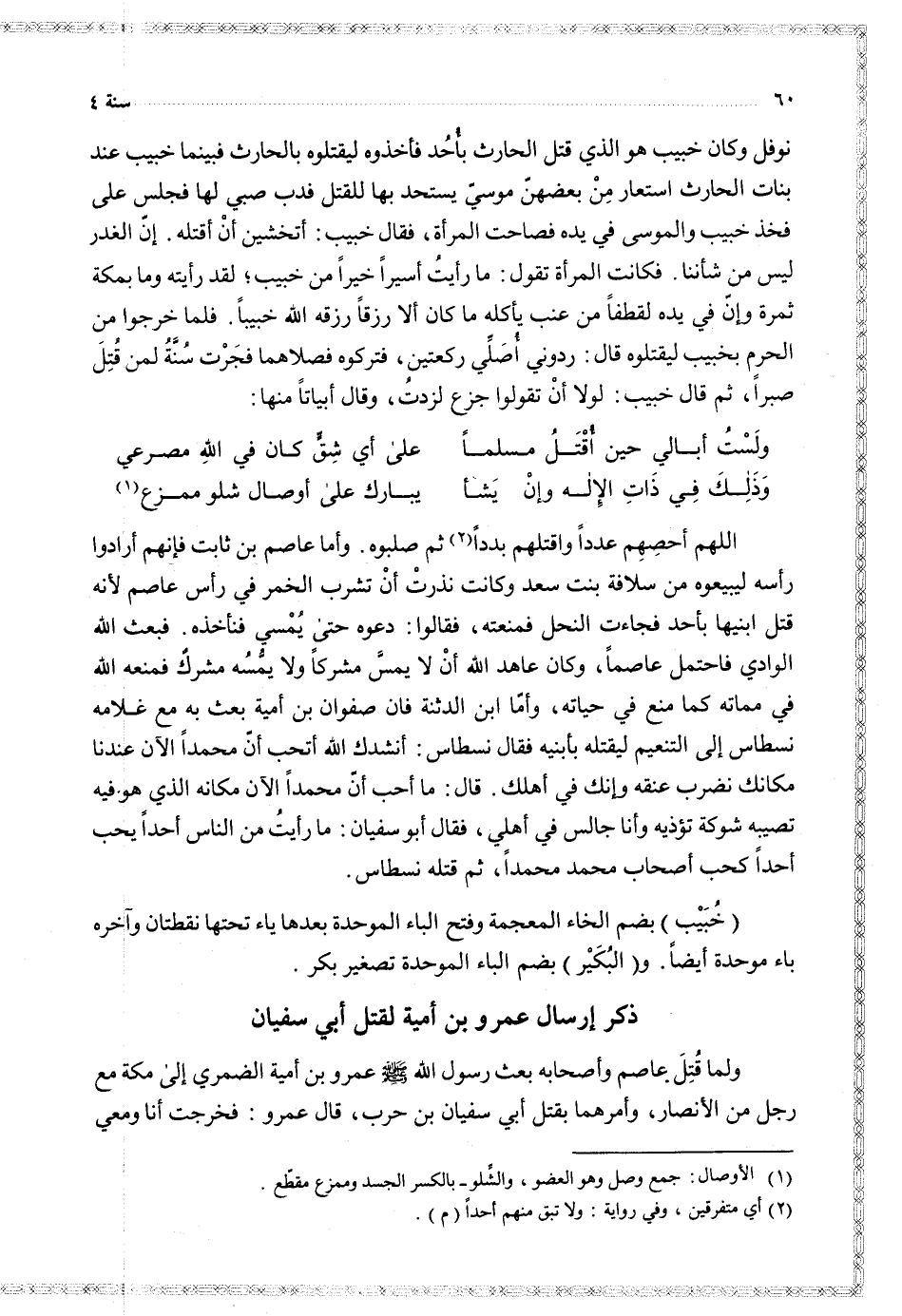 نوفل وكان خبيب هو الذي قتل الحارث بأحد فأخذوه ليقتلوه بالحارث فبينما خبيب عند بنات الحارث استعار من بعضهن موسى يستحد بها للقتل فدب صبي لها فجلس على فخذ حبيب والموسى في يده فصاحت المرأة فقال خبيب أتخشين أن اقتله إن الغدر ليس من شأننا فكانت المرأة تقول ما رأيت أسيرا خيرا من خبيب لقد رأيته وما بمكة ثمرة وإن في يده لقطف من عنب يأكله ما كان إلا رزقا رزقه الله خبيبا فلما خرجوا من الحرم بخبيب ليقتلوه قال ردوني أصلي ركعتين فتركوه فصلاهما فجرت سنة لمن قتل صبرا ثم قال خبيب لولا أن تقولوا جزع لزدت وقال أبياتا منها