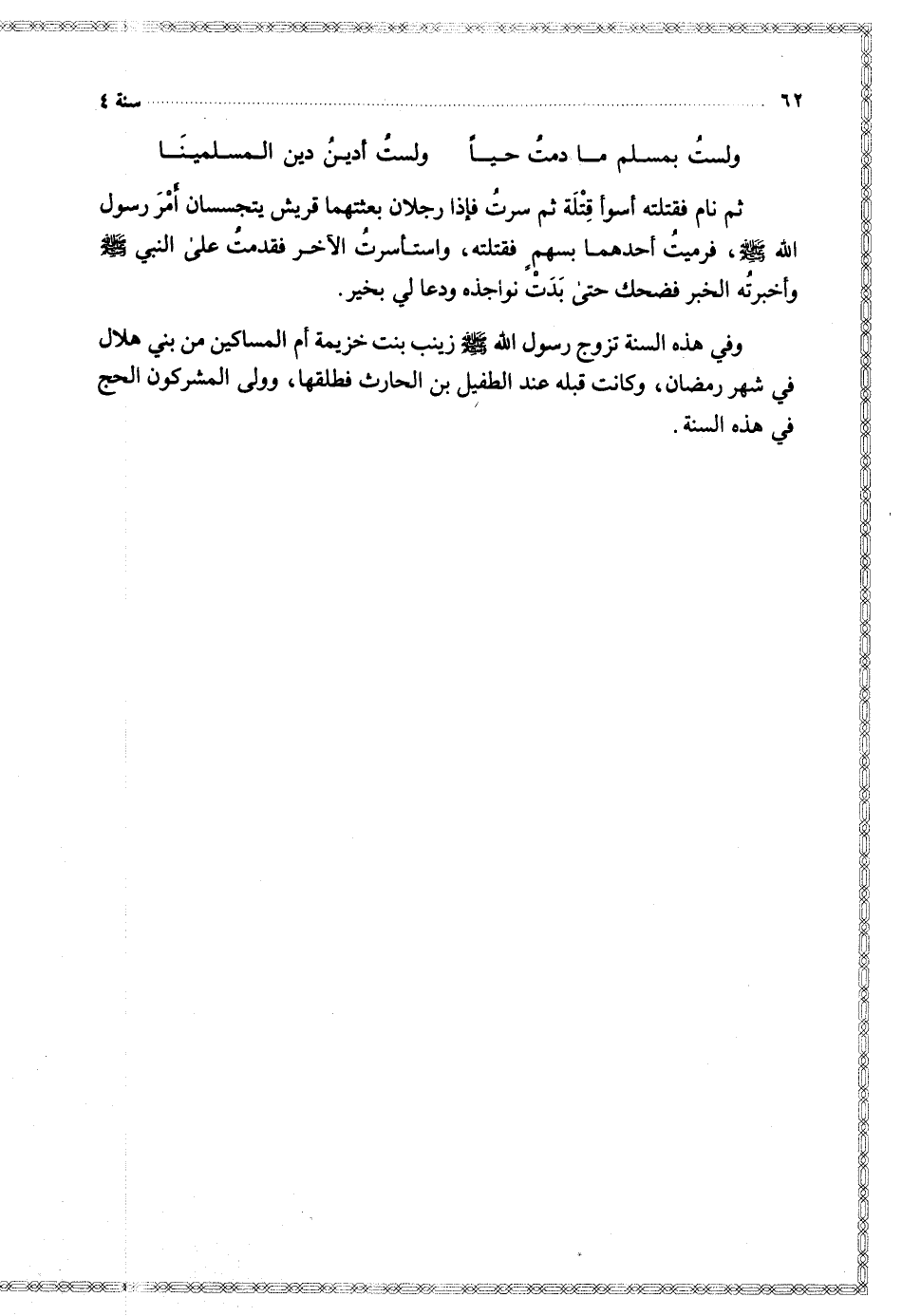 وفي هذه السنة تزوج رسول الله زينب بنت خزيمة أم المساكين من بني هلال في شهر رمضان وكانت قبله عند الطفيل بن الحارث فطلقها وولى المشركون الحج في هذه السنة