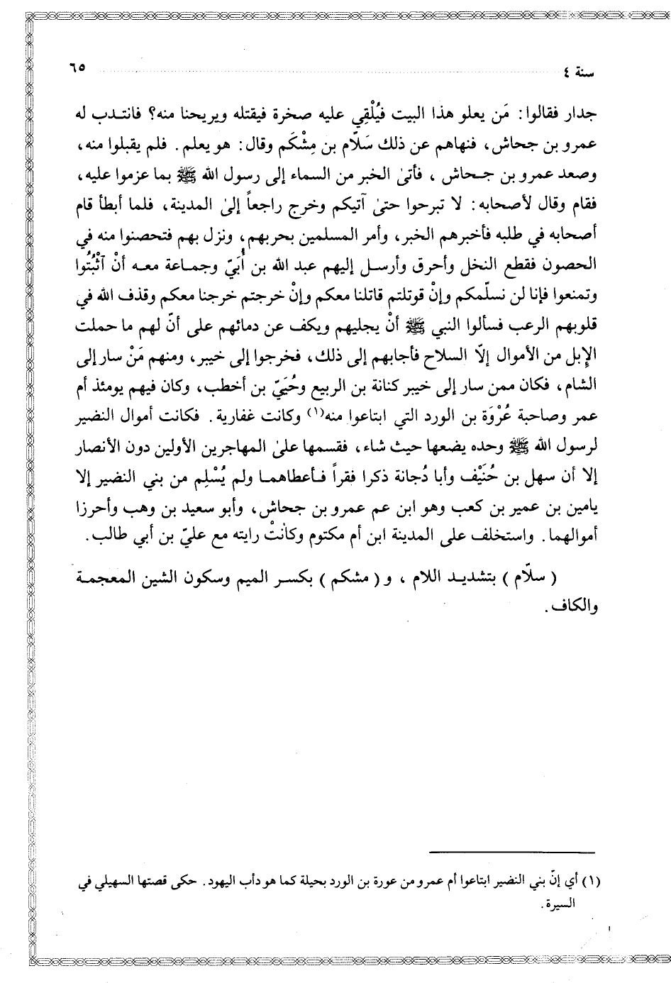 جدار فقالوا من يعلو هذا البيت فيلقي عليه صخرة فيقتله ويريحنا منه فانتدب له عمرو بن جحاش فنهاهم عن ذلك سلام بن مشكم وقال هو يعلم فلم يقبلوا منه وصعد عمرو بن جحاش فأتى الخبر من السماء إلى رسول الله بما عزموا عليه فقال وقال لأصحابه لا تبرحوا حتى آتيكم وخرج راجعا إلى المدينة فلما أبطأ قام أصحابه في طلبه فأخبرهم الخبر وأمر المسلمين بحربهم ونزل بهم فتحصنوا منه في الحصون فقطع النخل وأحرق وأرسل إليهم عبد الله بن أبي وجماعة معه أن اثبتوا وتمنعوا فإنا لن نسلمكم وإن قوتلتم قاتلنا معكم وإن خرجتم خرجنا معكم وقذف الله في قلوبهم الرعب فسألوا النبي أن يجليهم ويكف عن دمائهم على أن لهم ما حملت الإبل من الأموال إلا السلاح فأجابهم إلى ذلك فخرجوا إلى خيبر ومنهم من سار إلى الشام فكان ممن سار إلى خيبر كنانة بن الربيع وحيي بن أخطب وكان فيهم يومئذ أم عمر وصاحبة عروة بن الورد التي ابتاعوا منه وكان غفارية فكانت أموال النضير لرسول الله وحده يضعها حيث شاء فقسمها على المهاجرين الأولين دون الأنصار إلا أن سهل بن حنيف وأبا دجانة ذكرا فقرا فأعطاهما ولم يسلم من بني النضير إلا يامين بن عمير بن كعب وهو ابن عم عمرو بن جحاش وأبو سعيد بن وهب وأحرزا أموالهما واستخلف على المدينة ابن أم مكتوم وكانت رايته مع علي بن أبي طالب