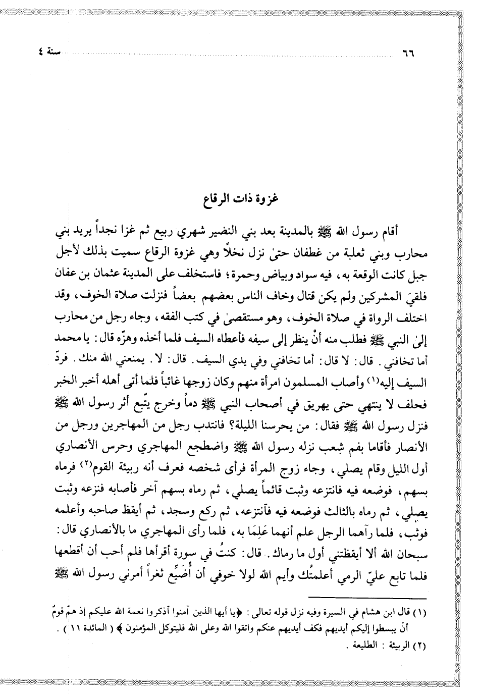 أقام رسول الله بالمدينة بعد بني النضير شهري ربيع ثم غزا نجدا يريد بني محارب وبني ثعلبة من غطفان حتى نزل نخلا وهي غزوة الرقاع سميت بذلك لأجل جبل كانت الوقعة به فيه سواد وبياض وحمرة فاستخلف على المدينة عثمان بن عفان فلقي المشركين ولم يكن قتال وخاف الناس بعضهم بعضا فنزلت صلاة الخوف وقد اختلف الرواة في صلاة الخوف وهو مستقصى في كتب الفقه وجاء رجل من محارب إلى النبي فطلب منه أن ينظر إلى سيفه فأعطاه السيف فلما أخذه وهزه قال يا محمد أما تخافني قال لا قال أما تخافني وفي يدي السيف قال لا يمنعني الله منك فرد السيف إليه وأصاب المسلمون امرأة منهم وكان زوجها غائبا فلما أتى أهله أخبر الخبر فحلف لا ينتهي حتى يهريق في أصحاب النبي دما وخرج يتبع أثر رسول الله فنزل رسول الله فقال من يحرسنا الليلة فانتدب رجل من المهاجرين ورجل من الأنصار فأقاما بفم شعب نزله رسول الله واضطجع المهاجري وحرس الأنصاري أول الليل وقام يصلي وجاء زوج المرأة فرأى شخصه فعرف أنه ربيئة القوم فرماه بسهم فوضعه فيه فانتزعه وثبت قائما يصلي ثم رماه بسهم آخر فأصابه فنزعه وثبت يصلي ثم رماه بالثالث فوضعه فيه فانتزعه ثم ركع وسجد ثم أيقظ صاحبه وأعلمه فوثب فلما رآهما الرجل علم أنهما علما به فلما رأى المهاجري ما بالأنصاري قال سبحان الله ألا أيقظتني أول ما رماك قال كنت في سورة أقرأها فلم احب أن أقطعها فلما تابع علي الرمي أعلمتك وأيم الله لولا خوفي أن أضيع ثغرا أمرني رسول الله