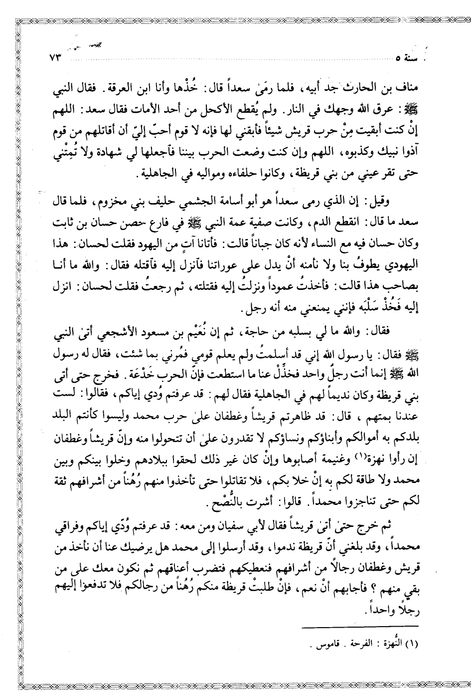 فقال والله ما لي بسلبه من حاجة ثم إن نعيم بن مسعود الأشجعي أتى النبي فقال يا رسول الله إني قد أسلمت ولم يعلم قومي فمرني بما شئت فقال له رسول الله غنما أنت رجل واحد فخذل عنا ما استطعت فإن الحرب خدعة فخرج حتى أتى بني قريظة وكان نديما لهم في الجاهلية فقال لهم قد عرفتم ودي إياكم فقالوا لست عندنا بمتهم قال قد ظاهرتم قريشا وغطفان على حرب محمد وليسوا كأنتم البلد بلدكم به أموالكم وأبناؤكم ونساؤكم لا تقدرون على أن تتحولوا منه وإن قريشا وغطفان إن رأوا نهزة وغنيمة أصابوها وإن كان غير ذلك لحقوا ببلادهم وخلوا بينكم وبين محمد ولا طاقة لكم به إن خلا بكم فلا تقاتلوا حتى تأخذوا منهم رهنا من أشرافهم ثقة لكم حتى تناجزوا محمدا قالوا أشرت بالنصح
