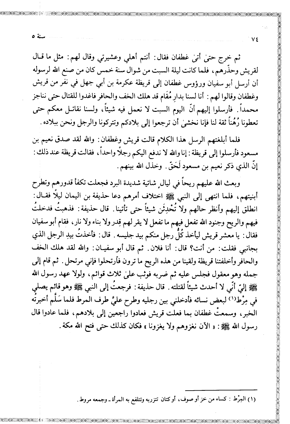 وبعث الله عليهم ريحا في ليال شاتية شديدة البرد فجعلت تكفأ قدورهم وتطرح أبنيتهم فلما انتهى إلى النبي اختلاف أمرهم دعا حذيفة بن اليمان ليلا فقال انطلق إليهم وانظر حالهم ولا تحدثن شيئا حتى تأتينا قال حذيفة فذهبت فدخلت فيهم والريح وجنود الله تفعل فيهم ما تفعل لا يقر لهم قدر ولا بناء ولا نار فقام أبو سفيان فقال يا معشر قريش ليأخذ كل رجل منكم بيد جليسه قال فأخذت بيد الرجل الذي بجانبي فقلت من أنت قال أنا فلان ثم قال أبو سفيان والله لقد هلك الخف والحافر وأخلفتنا قريظة ولقينا من هذه الريح ما ترون فارتحلوا فإني مرتحل ثم قام إلى جمله وهو معقول فجلس عليه ثم ضربه فوثب على ثلاثة قوائم ولولا عهد رسول الله إلي أني لا أحدث شيئا لقتلته قال حذيفة فرجعت إلى النبي وهو قائم يصلي في مرط لبعض نسائه فأدخلني بين رجليه وطرح علي طرف المرط فلما سلم أخبرته الخبر وسمعت غطفان بما فعلت قريش فعادوا راجعين إلى بلادهم فلما عادوا قال رسول الله ( الآن نغزوهم ولا يغزونا ) فكان كذلك حتى فتح الله مكة