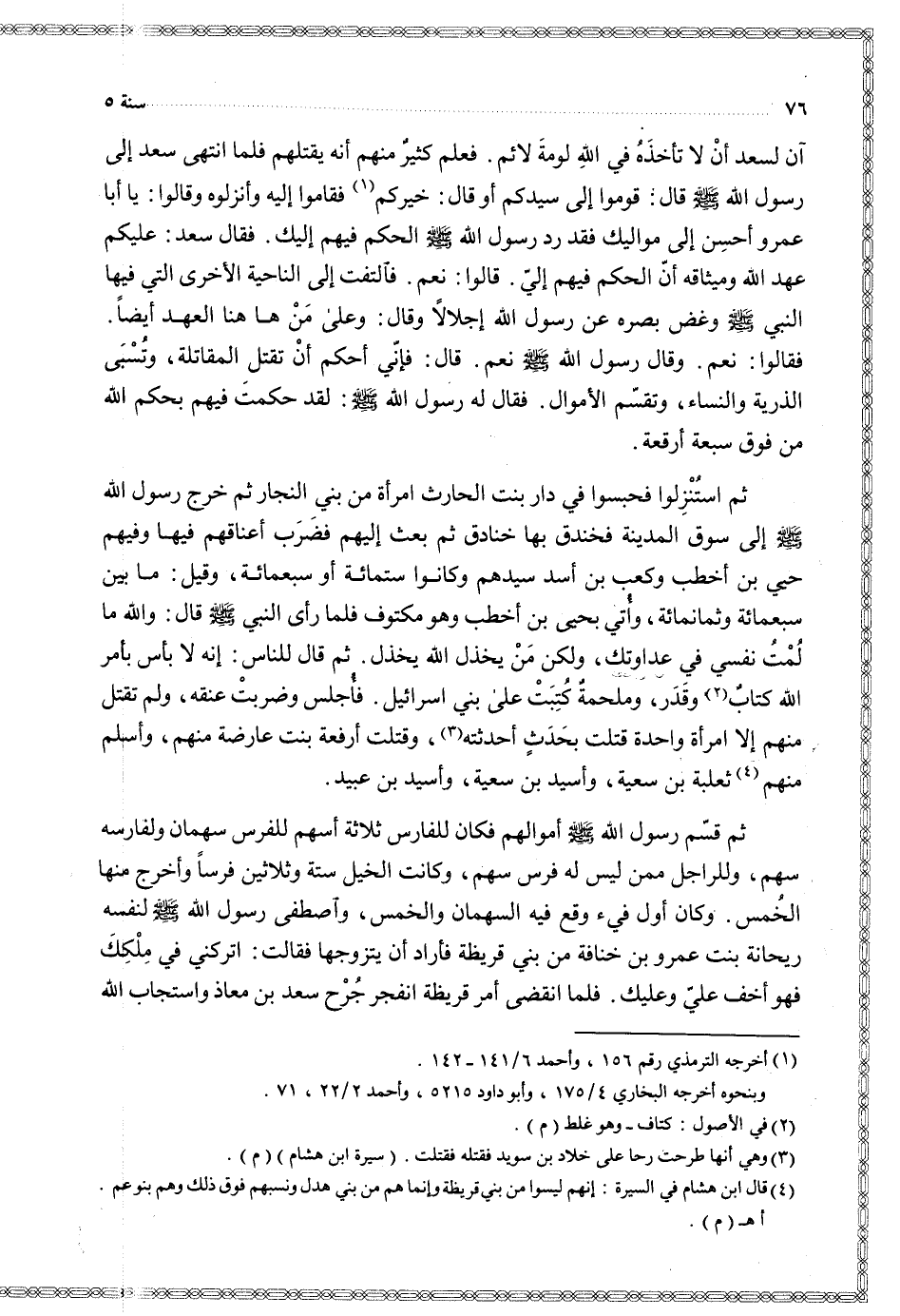 آن لسعد أن لا تأخذه في الله لومة لائم فعلم كثير منهم انه يقتلهم فلما انتهى سعد إلى رسول الله قال قوموا إلى سيدكم أو قال خيركم فقاموا إليه وأنزلوه وقالوا يا أبا عمرو أحسن إلى مواليك فقد رد رسول الله الحكم فيهم إليك فقال سعد عليكم عهد الله وميثاقه أن الحكم فيهم إلي قالوا نعم فالتفت إلى الناحية الأخرى التي فيها النبي وغض بصره عن رسول الله إجلالا وقال وعلى من هاهنا العهد أيضا فقالوا نعم وقال رسول الله نعم قال فإني أحكم أن تقتل المقاتلة وتسبى الذرية والنساء وتقسم الأموال فقال له رسول الله لقد حكمت فيهم بحكم الله من فوق سبعة أرقعة