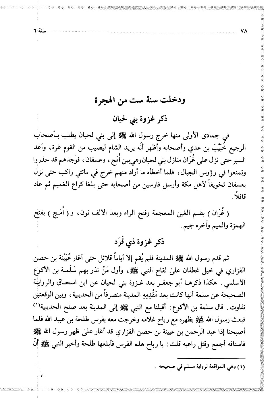 ثم قدم رسول الله المدينة فلم يقم إلا أياما قلائل حتى أغار عيينة بن حصن الفزاري في خيل غطفان على لقاح النبي وأول من نذر بهم سلمة بن الأكوع الأسلمي هكذا ذكرها أبو جعفر بعد غزوة بني لحيان عن ابن إسحاق والرواية الصحيحة عن سلمة أنها كانت بعد مقدمه المدينة منصرفا من الحديبية وبين الوقعتين تفاوت قال سلمة بن الأكوع أقبلنا مع النبي إلى المدينة بعد صلح الحديبية فبعث رسول الله بظهره مع رباح غلامه وخرجت معه بفرس طلحة بن عبيد الله فلما أصبحنا إذا عبد الرحمن بن عيينة بن حصن الفزاري قد أغار على ظهر رسول الله فاستاقه أجمع وقتل راعيه قلت يا رباح هذه الفرس فأبلغها طلحة وأخبر النبي أن