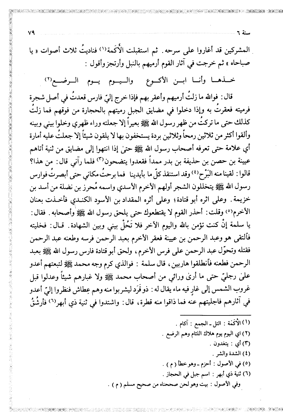 المشركين قد أغاروا على سرحه ثم استقبلت الأكمة فناديت ثلاثة أصوات يا صباحاه ثم خرجت في آثار القوم أرميهم بالنبل وأرتجز وأقول