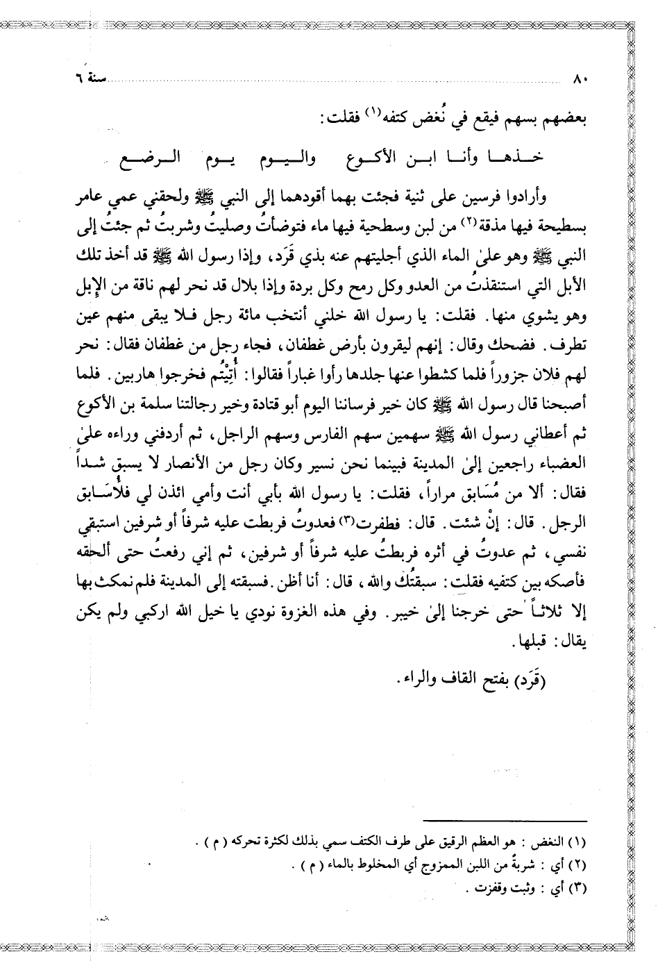 وأرادوا فرسين على ثنية فجئت بهما أقودهما إلى النبي ولحقني عمي عامر بسطيحة فيها مذقة من لبن وسطحية فيها ماء فتوضأت وصليت وشربت ثم جئت إلى النبي وهو على الماء الذي أجليتهم عنه بذي قرد وإذا رسول الله قد أخذ تلك الإبل التي استنقذت من العدو وكل رمح وكل بردة وإذا بلال قد نحر لهم ناقة من الإبل وهو يشوي منها فقلت يا رسول الله خلني أنتخب مائة رجل فلا يبقى منهم عين تطرف فضحك وقال إنهم ليقرون بأرض غطفان فجاء رجل من غطفان فقال نحر لهم فلان جزورا فلما كشطوا عنها جلدها رأوا غبارا فقالوا أتيتم فخرجوا هاربين فلما أصبحنا قال رسول الله كان خير فرساننا اليوم أبو قتادة وخير رجالتنا سلمة بن الأكوع ثم أعطاني رسول الله سهمين سهم الفارس وسهم الراجل ثم أردفني وراءه على العضباء راجعين إلى المدينة فبينما نحن نسير وكان رجل من الأنصار لا يسبق شدا فقال ألا من مسابق مرارا فقلت يا رسول الله بأبي أنت وأمي ائذن لي فلأسابق الرجل قال إن شئت قال فطفرت فعدوت فربطت عليه شرفا أو شرفين ثم إني رفعت حتى ألحقه فأصكه بين كتفيه فقلت سبقتك والله قال أنا أظن فسبقته إلى المدينة فلم نمكث بها إلا ثلاثا حتى خرجنا إلى خيبر وفي هذه الغزوة نودي يا خيل الله اركبي ولم يكن يقال قبلها