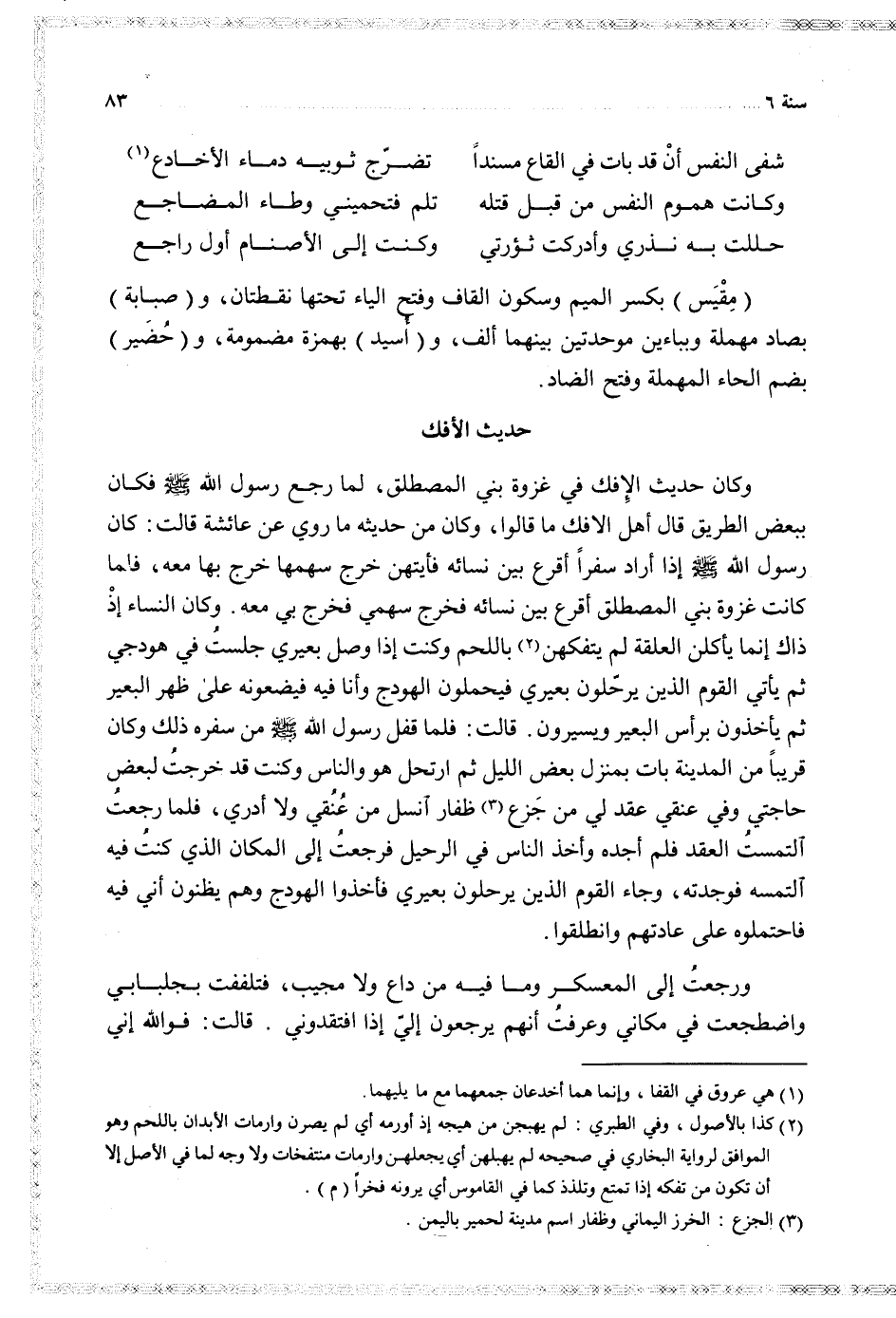 ( حللت به نذري وأدركت ثؤرتي ... وكنت إلى الأصنام أول راجع ) مقيس بكسر الميم وسكون القاف وفتح الياء تحتها نقطتان وصبابة بصاد مهملة وببائين موحدتين بينهما ألف وأسيد بهمزة مضمومة وحضير بضم الحاء المهملة وفتح الضاد $ حديث الإفك $