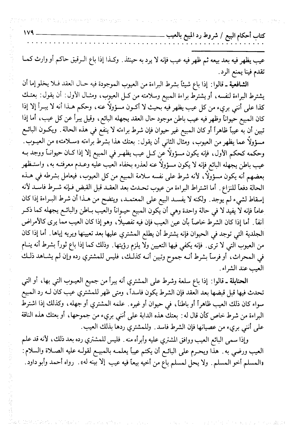 الحنابلة - قالوا: إذا باع سلعة وشرط على المشتري أنه يبرأ من جميع العيوب التي بها، أو التي تحدث فيها قبل قبضها بعد العقد فإن الشرط يكون فاسداً، ومتى ظهر للمشتري عيب كان له رده المبيع سواء كان ذلك العيب ظاهراً أو باطناً، في حيوان أو غيره. علمه المشتري أو جهله، وكذلك إذا اشترط البراءة من شرط خاص كأن قال له: بعتك هذه الدابة على أنني بريء من جموحها، أو بعتك هذه الناقة على أنني بريء من عصيانها فإن الشرط فاسد. وللمشتري ردها بذلك العيب.