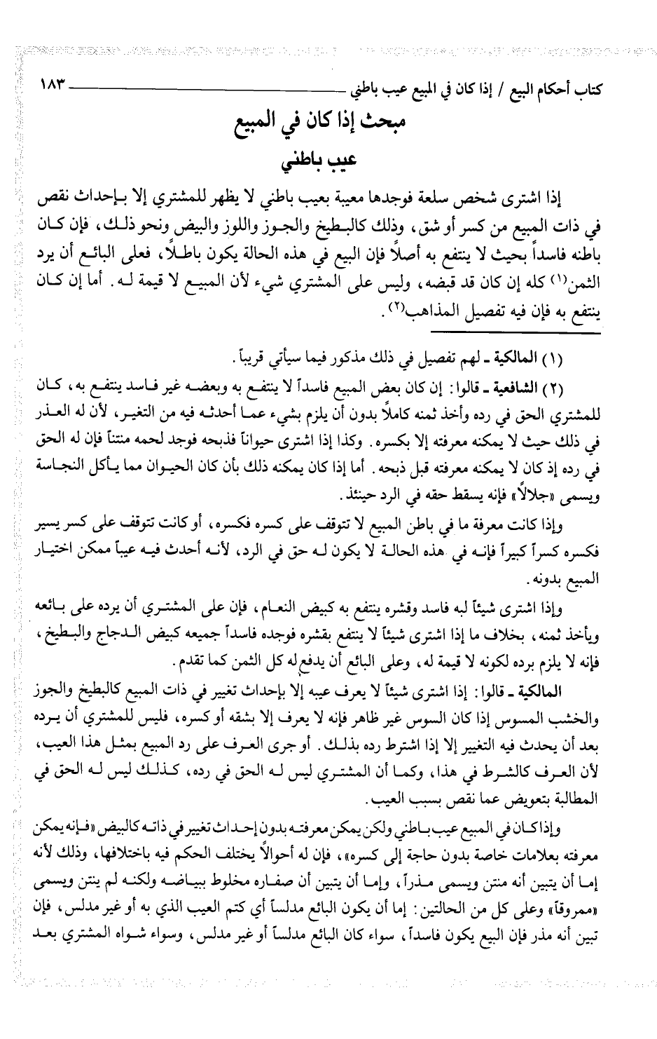 إذا اشترى شخص سلعة فوجدها معيبة بعيب باطني لا يظهر للمشتري إلا بإحداث نقص في ذات المبيع من كسر أو شق، وذلك كالبطيخ والجوز واللوز والبيض ونحو ذلك، فإن كان باطنه فاسداً بحيث لا ينتفع به أصلاً فإن البيع في هذه الحالة يكون باطلاً، فعلى البائع أن يرد الثمن (¬1) كله إن كان قد قبضه، وليس على المشتري شيء لأن المبيع لا قيمة له. أما إن كان ينتفع به فإن فيه تفصيل المذاهب (¬2) .