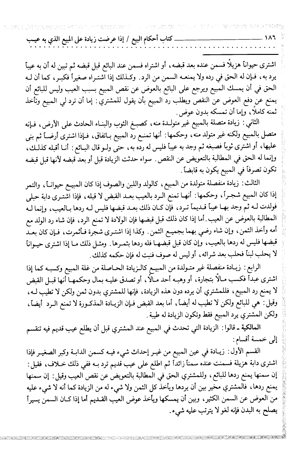 الثالث: زيادة منفصلة متولدة من المبيع، كالولد واللبن والصوف إذا كان المبيع حيواناً، والتمر إذا كان المبيع شجراً، وحكمها: أنها تمنع الرد بالعيب بعد القبض لا قبله، فإذا اشترى دابة حبلى فولدت له ثم وجد بها عيباً قديماً ترد، فإن كان ذلك بعد قبضها فليس له ردها بالعيب، وإنما له المطالبة بالعوض عن العيب. أما إذا كان ذلك قبل قبضها فإن الولادة لا تمنع الرد، فإن شاء رد الولد مع أمه وأخذ الثمن، وإن شاء رضي بهما بجميع الثمن. وكذا إذا اشترى شجرة فأثمرت، فإن كان بعد قبضها فليس له ردها بالعيب، وإن كان قبل قبضها فله ردها بثمرها ومثل ذلك ما إذا اشترى حيواناً لا يحلب لبناً فحلب بعد شرائه، أو ليس له صوف فنبت له فإن حكمه كذلك.
