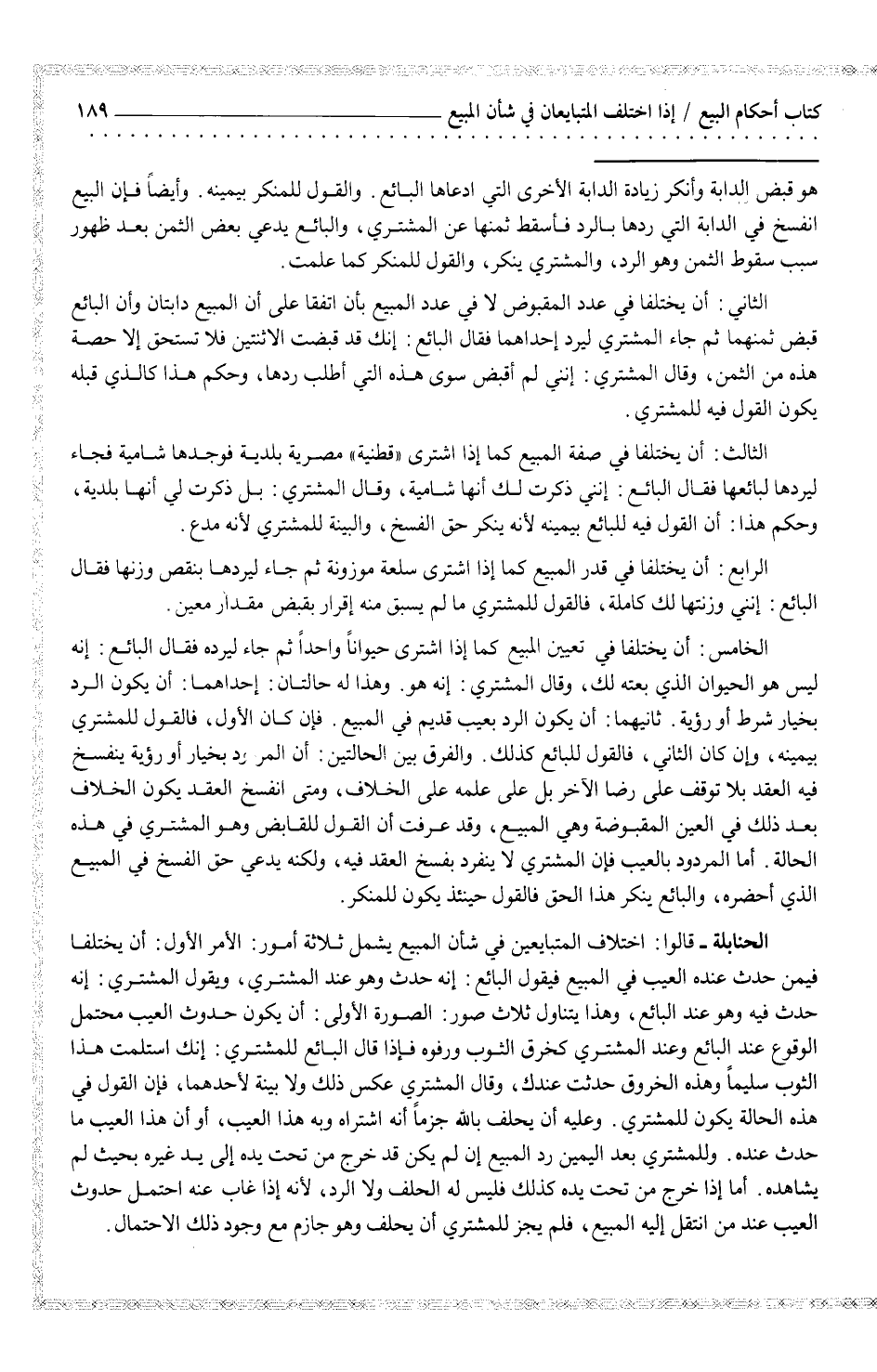الثالث: أن يختلفا في صفة المبيع كما إذا اشترى "قطنية" مصرية بلدية فوجدها شامية فجاء ليردها لبائعها فقال البائع: إنني ذكرت لك أنها شامية، وقال المشري: بل ذكرت لي أنها بلدية، وحكم هذا: أن القول فيه للبائع بيمينه لأنه ينكر حق الفسخ، والبينة للمشتري لأنه مدع.