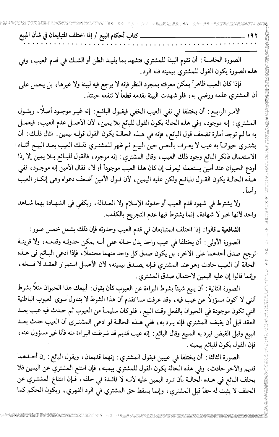 الأمر الرابع: أن يختلفا في نفي العيب الخفي فيقول البائع: إنه غير موجود أصلاً، ويقول المشتري: إنه موجود، وفي هذه الحالة يكون القول للبائع بلا يمين، لأن الأصل عدم العيب، فيعمل به ما لم توجد أمارة تضعف قول البائع، فإنه في هذه الحالة يكون القول قوله بيمين. مثال ذلك: أن يشتري حيواناً به عيب لا يعرف بالحس حين البيع ثم ظهر للمشتري ذلك العيب بعد البيع أثناء الاستعمال فأنكر البائع وجود ذلك العيب، وقال المشتري: إنه موجود، فالقول للبائع بلا يمين إلا إذا أودع الحيوان عند أمين يستعمله ليعرف إن كان هذا العيب موجوداً أو لا، فقال الأمين إنه موجود، ففي هذه الحالة يكون القول للبائع ولكن عليه اليمين، لأن قول الأمين أضعف دعواه وهي إنكار العيب رأساً.