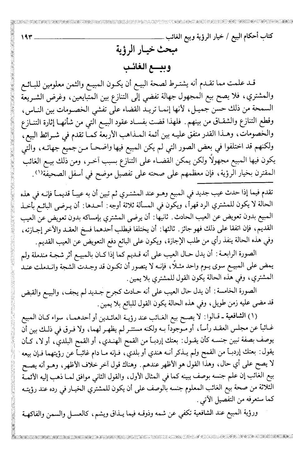 (¬1) الشافعية - قالوا: لا يصح بيع الغائب عند رؤية العائدين أو أحدهما، سواء كان المبيع غائباً عن مجلس العقد رأساً، أو موجوداً به ولكنه مستتر لم يظهر لهما، ولا فرق في ذلك بين أن يوصف بصفة نبين جنسه كأن يقول: بعتك إردباً من القمح الهندي، أو القمح البلدي، أو لا، كأن يقول: بعتك إردباً من القمح ولم يذكر أنه هندي أو بلدي، فإنه ما دام غائباً عن ريتهما فإن بيعه لا يصح عل أي حال، وهذا القول هو الأظهر عندهم. وهناك قول آخر خلاف الأظهر، وهو أن يصح بيع الغائب إن علم جنسه بوصف يبينه كما في المثال الأول، والقول الثاني موافق لما ذهب إليه الأئمة الثلاثة من صحة بيع الغائب المعلوم جنسه بالوصف على أن يكون للمشتري الخيار في رده عند رؤيته كما ستعرفه من التفصيل الآتي.