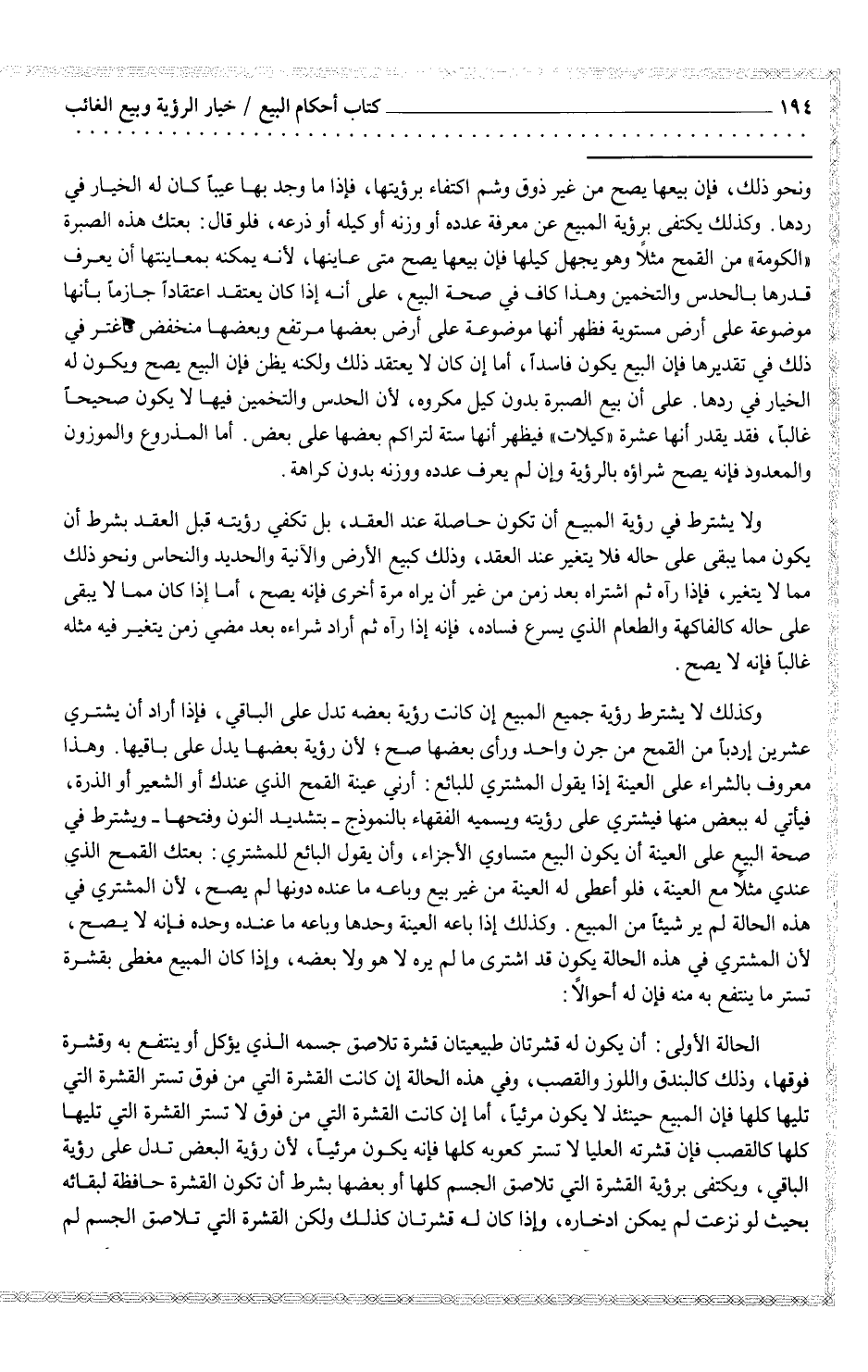 ونحو ذلك، فإن بيعها يصح من غير ذوق وشم اكتفاء برؤيتها، فإذا ما وجد بها عيباً كان له الخيار في ردها. وكذلك يكتفي برؤية المبيع عن معرفة عدده أو وزنه أو كيله أو ذرعه، فلو قال: بعتك هذه الصبرة "الكومة" من القمح مثلاً وهو يجهل كيلها فإن بيعها يصح متى عاينها، لأنه يمكنه بمعاينتها أن يعرف قدرها بالحدس والتخمين وهذا كاف في صحة البيع، على أنه إذا كان يعتقد اعتقاداً جازماً بأنها موضوعة على أرض مستوية فظهر أنها موضوعة على أرض بعضها مرتفع وبعضها منخفض فاغترفي ذلك في تقديرها فإن البيع يكون فاسداً، أما إن كان لا يعتقد ذلك ولكنه يظن فإن البيع يصح ويكون له الخيار في ردها. على أن بيع الصبرة بدون كيل مكروه، لأن الحدس والتخمين فيها لا يكون صحيحاً غالباً، فقد يقدر أنها عشرة "كيلات" فيظهر أنها ستة لتراكم بعضها على بعض. أما المذروع والموزون والمعدود فإنه يصح شراؤه بالرؤية وإن لم يعرف عدده ووزنه بدون كراهة.