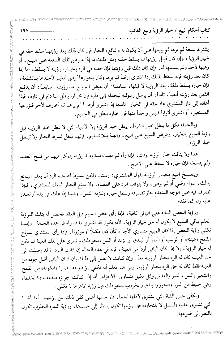 يشترط سلعة لم يرها ثم يبيعها على أن يكون له "البائع" الخيار فإن كان ذلك بعد رؤيتها سقط حقه في خيار الرؤية، وإن كان قبل رؤيتها لم يسقط حقه ومثل ذلك ما إذا عرض تلك السلعة على البيع، أو وهبها لأحد ولم يسلمها له، فإن كان ذلك قبل رؤيتها فإن حقه في الرد بخيار الرؤية لا يسقط، أما إذا كان بعد رؤيته فإنه يسقط بذلك إذا اشترى أرضاً لم يرها وكان بجوارها أرض للغير فأخذها بالشفعة، فإن خياره يسقط بذلك بعد الرؤية لا قبلها، سادساً: أن يقبض المبيع بعد رؤيته. سابعاً: أن يدفع الثمن بعد رؤيته أيضاً، ثامناً: أن يرسل رسوله ليحمله إلى داره فإن خياره يبطل ما دام في داره، فإذا أعاده إلى دار المشتري عاد حقه في الخيار. تاسعاً إذا اشترى أرضاً لم يرها ثم أعارها لآخر فزرعها المستعير، أو اشترى أثواباً فلبس واحداً منها فإن خياره يبطل في الجميع.