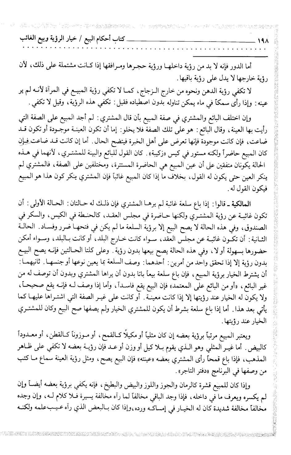 ويعتبر المبيع مرتباً برؤية بعضه إن كان مثلياً أو مكيلاً كالقمح، أو موزوناً كالقطن، أو معدوداً كالبيض. أما غير المثلي وهو الذي يقوم بلا كيل أو وزن أو عد فإن رؤية بعضه لا تكفي على ظاهر المذهب، فإذا باع قمحاً رأى المشتري بعضه "عينته" فإن البيع يصح، ومثل رؤية العينة سماع ما كتب من وصفها في البرنامج "دفتر التاجر".