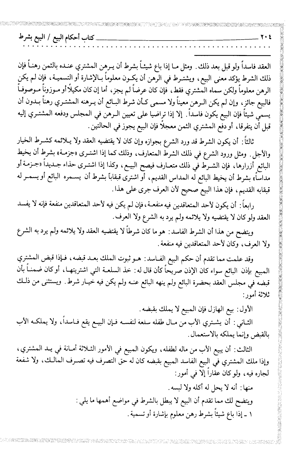 العقد فاسداً ولو قبل بعد ذلك. ومثل ما إذا باع شيئاً بشرط أن يرهن المشتري عنده بالثمن رهناً فإن ذلك الشرط يؤكد معنى البيع، ويشترط في الرهن أن يكون معلوماً بالإشارة أو التسمية، فإن لم يكن الرهن معلوماً ولكن سماه المشتري فقط، فإن كان عرضاً لم يجز، أما إن كان مكيلاً أو موزوناً موصوفاً فالبيع جائز، وإن لم يكن الرهن معيناً ولا مسمى كأن شرط البائع أن يرهنه المشتري رهناً بدون أن يسمي شيئاً فإن البيع يكون فاسداً. إلا إذا تراضيا على تعيين الرهن في المجلس ودفعه المشتري إليه قبل أن يتفرقا، أو دفع المشتري الثمن معجلاً فإن البيع يجوز في الحالتين.