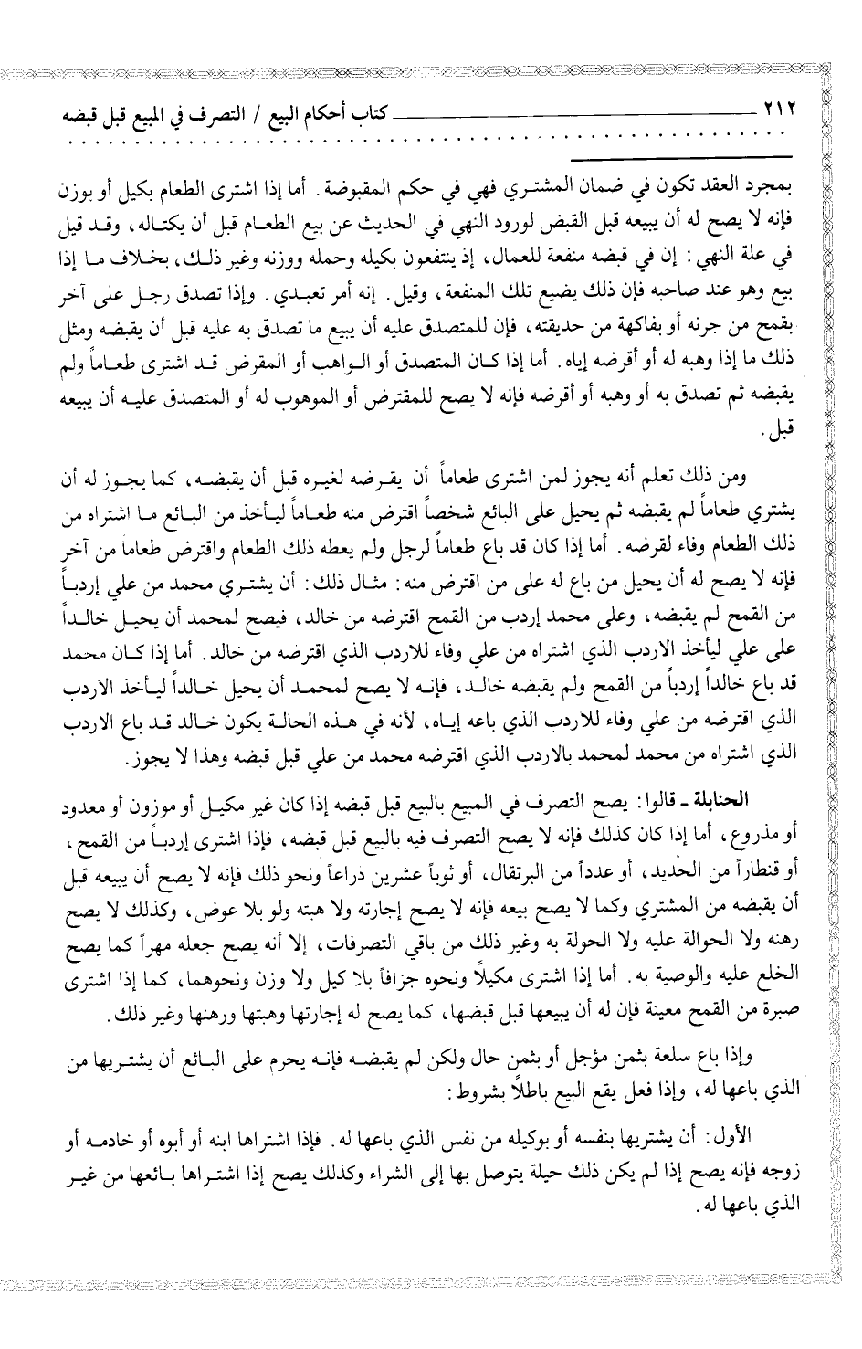 الحنابلة - قالوا: يصح التصرف في المبيع بالبيع قبل قبضه إذا كان غير مكيل أو موزون أن معدود أو مذروع، أما إذا كان كذلك فإنه لا يصح التصرف فيه بالبيع قبل قبضه، فإذا اشترى إردباً من القمح، أو قنطاراً من الحديد، أو عدداً من البرتقال، أو ثوباً عشرين ذراعاً ونحو ذلك فإنه لا يصح أن يبيعه قبل أن يقبضه من المشتري وكما لا يصح بيعه فإنه لا يصح إجارته ولا هبته ولو بلا عوض، وكذلك لا يصح رهنه ولا الحوالة عليه ولا الحولة به وغير ذلك من باقي التصرفات، غلا أنه يصح جعله مهراً كما يصح الخلع عليه والوصية به. أما إذا اشترى مكيلاً ونحوه جزافاً بلا كيل ولا وزن ونحوهما، كما إذا اشترى صبرة من القمح معينة فإن له أن يبيعها قبل قبضها، كما يصح له إجارتها وهبتها ورهنها وغير ذلك.