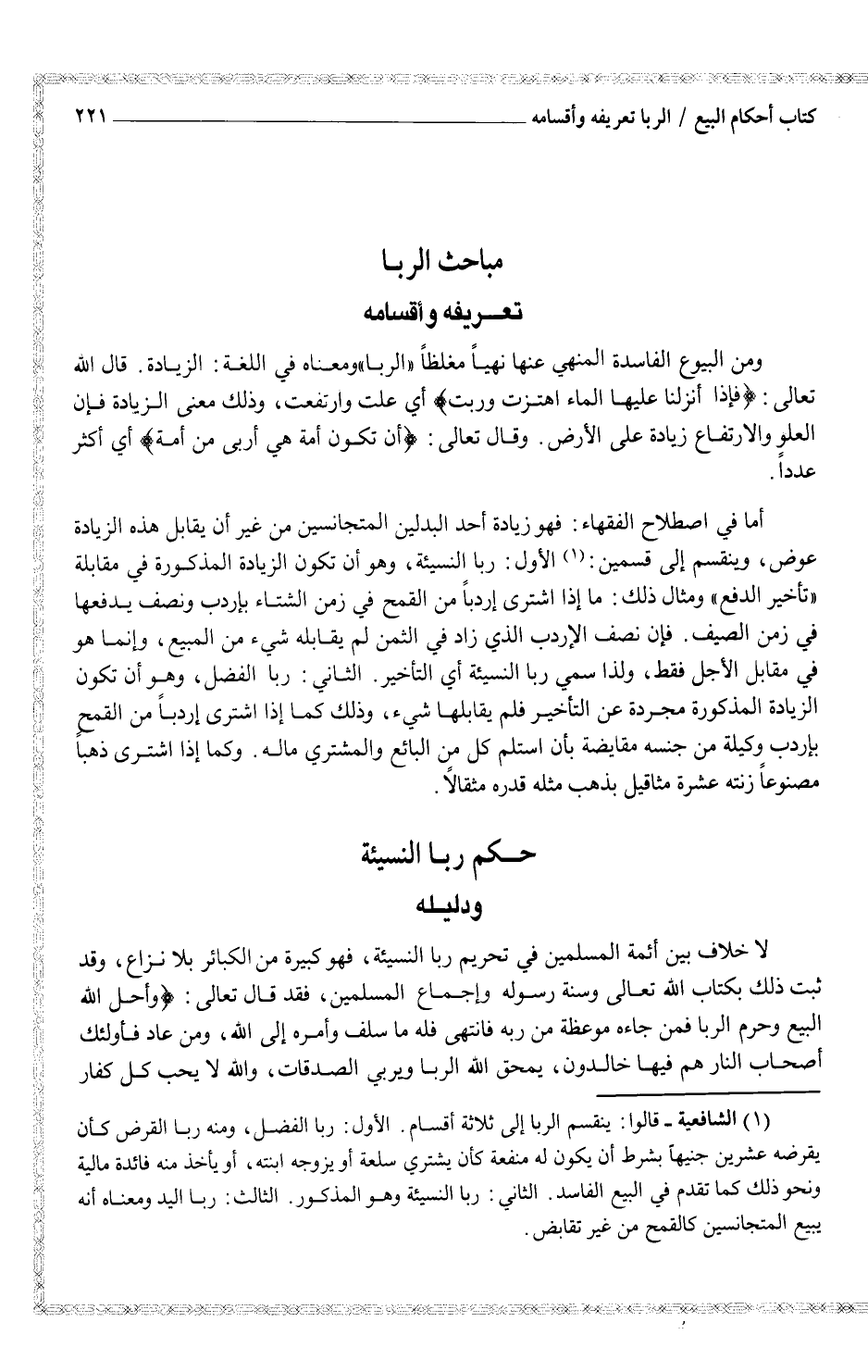أما في اصطلاح الفقهاء: فهو زيادة أحد البدلين المتجانسين من غير أن يقابل هذه الزيادة عوض، وينقسم إلى قسمين: (¬1) الأول: ربا النسيئة، وهو أن تكون الزيادة المذكورة في مقابلة "تأخير الدفع" ومثال ذلك: ما إذا اشترى إردباً من القمح في زمن الشتاء بإردب ونصف يدفعها في زمن الصيف. فإن نصف الإردب الذي زاد في الثمن لم يقابله شيء من المبيع، وإنما هو في مقابل الأجل فقط، ولذا سمي ربا النسيئة أي التأخير. الثاني: ربا الفضل، وهو أن تكون الزيادة المذكورة مجردة عن التأخير فلم يقابلها شيء، وذلك كما إذا اشترى إردباً من القمح بإردب وكيلة من جنسه مقايضة بأن استلم كل من البائع والمشتري ماله. وكما إذا اشترى ذهباً مصنوعاً زنته عشرة مثاقيل بذهب مثله قدره مثقالاً.