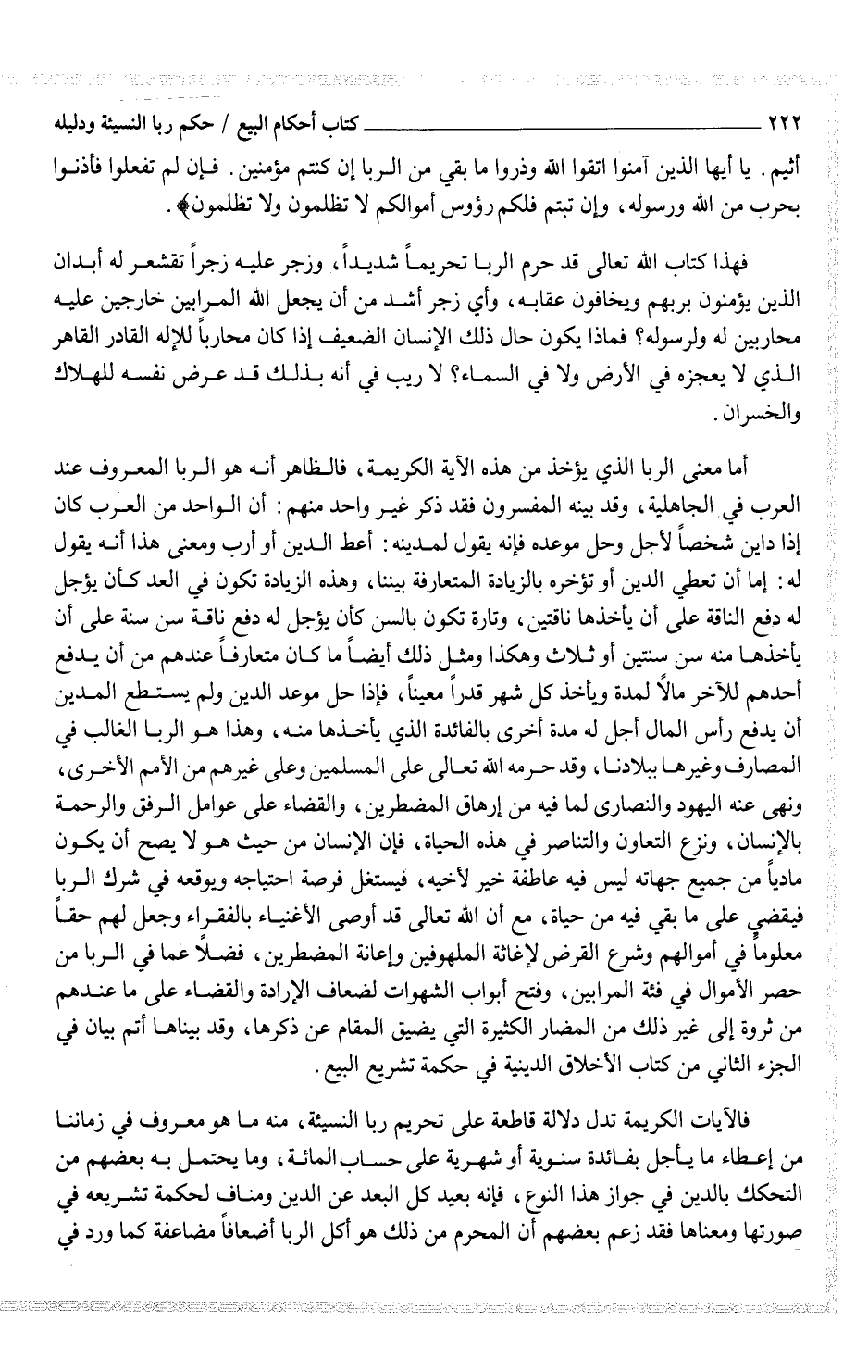 أما معنى الربا الذي يؤخذ من هذه الآية الكريمة، فالظاهر أنه هو الربا المعروف عند العرب في الجاهلية، وقد بينه المفسرون فقد ذكر غير واحد منهم: أن الواحد من العرب كان إذا داين شخصاً لأجل وحل موعده فإنه يقول لمدينة: أعط الدين أو أرب ومعنى هذا أنه يقول له: إما أن تعطي الدين أو تؤخره بالزيادة المتعارفة بيننا، وهذه الزيادة تكون في العد كأن يؤجل له دفع الناقة على أن يأخذها ناقتين، وتارة تكون بالسن كأن يؤجل له دفع ناقة سن سنة على أن يأخذها منه سن سنتين أو ثلاث وهكذا ومثل ذلك أيضاً ما كان متعارفاً عندهم من أن يدفع أحدهم للآخر مالاً لمدة ويأخذ كل شهر قدراً معيناً، فإذا حل موعد الدين ولم يستطع المدين أن يدفع رأس المال أجل له مدة أخرى بالفائدة الذي يأخذها منه، وهذا هو الربا الغالب في المصارف وغيرها ببلادنا، وقد حرمه الله تعالى على المسلمين وعلى غيرهم من الأمم الأخرى، ونهى عنه اليهود والنصارى لما فيه من إرهاق المضطرين، والقضاء على عوامل الرفق والرحمة بالإنسان، ونزع التعاون والتناصر في هذه الحياة، فإن الإنسان من حيث هو لا يصح أن يكون مادياً من جميع جهاته ليس فيه عاطفة خير لأخيه، فيستغل فرصة احتياجه ويوقعه في شرك الربا فيقضى على ما بقي فيه من حياة، مع أن الله تعالى قد أوصى الأغنياء بالفقراء وجعل لهم حقاً معلوماً في أموالهم وشرع القرض لإغاثة الملهوفين وإعانة المضطرين، فضلاً عما في الربا من حصر الأموال في فئة المرابين، وفتح أبواب الشهوات لضعاف الإرادة والقضاء على ما عندهم من ثروة إلى غير ذلك من المضار الكثيرة التي يضيق المقام عن ذكرها، وقد بيناها أتم بيان في الجزء الثاني من كتاب الأخلاق الدينية في حكمة تشريع البيع.