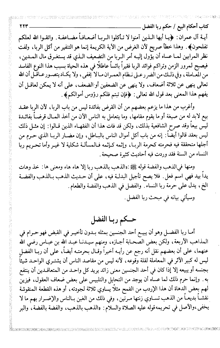 أما ربا الفضل وهو أن يبيع أحد الجنسين بمثله بدون تأخير في القبض فهو حرام في المذاهب الأربعة، ولكن بعض الصحابة أجازه، ومنهم سيدنا عبد الله بن عباس رضي الله عنهما، على أن بعضهم نقل أنه رجع عن رأيه أخيراً وقال بحرمته أيضاً، على أن ربا الفضل ليس له كبير الأثر في المعاملة لقلة وقوعه، لأن ليس من مقاصد الناس أن يشتري الواحد شيئاً بجنسه أو يبيعه إلا إذا كان في أحد الجنسين معنى زائد يريد كل واحد من المتعاقدين أن ينتفع به. وإنما حرم ذلك لما عساه أن يوجد من التحايل والتلبيس على بعض ضعاف العقول، فيزين لهم بعض الدهاة أن هذا الإردب من القمح مثلاً يساوي ثلاثة لجودته، أو هذه القطعة المنقوشة نقشاً بديعاً من الذهب تساوي زنتها مرتين، وفي ذلك من الغبن بالناس والإضرار بهم مالا يخفى، والأصل في تحريمه قوله عليه الصلاة والسلام: "الذهب بالذهب، والفضة بالفضة، والبر
