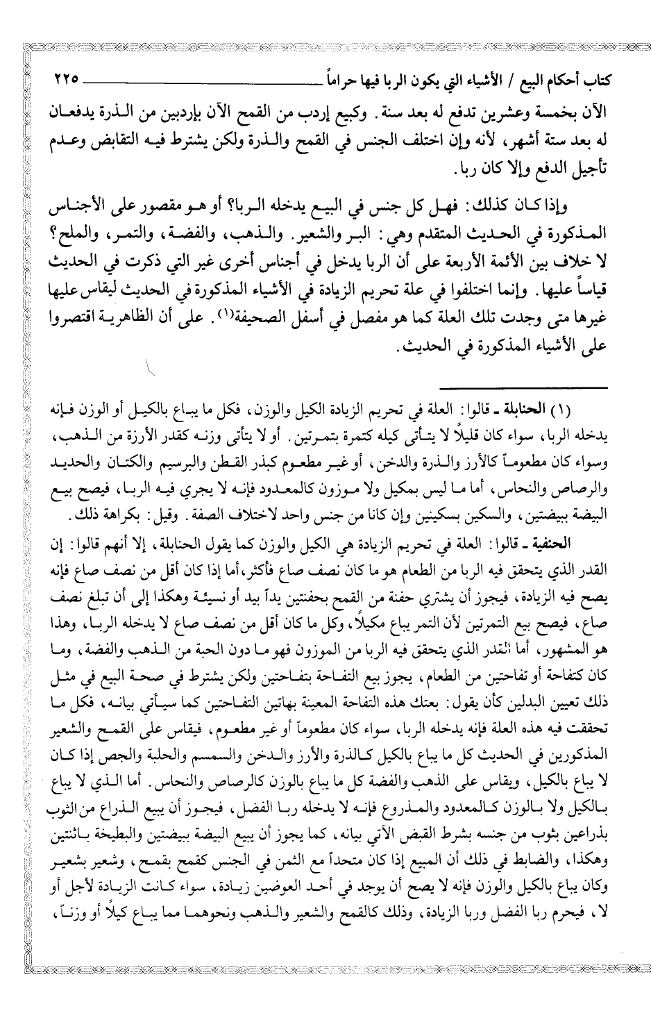 الحنفية - قالوا: العلة في تحريم الزيادة هي الكيل والوزن كما يقول الحنابلة، إلا أنهم قالوا: إن القدر الذي يتحقق فيه الربا من الطعام هو ما كان نصف صاع فأكثر، أما إذا كان أقل من نصف صاع فإنه يصح فيه الزيادة، فيجوز أن يشتري حفنة من القمح بحفنتين يداً بيد أو نسيئة وهكذا إلى أن تبلغ نصف صاع، فيصح بيع التمرتين لأن التمر يباع مكيلاً، وكل ما كان أقل من نصف صاع لا يدخله الربا، وهذا هو المشهور، أما القدر الذي يتحقق فيه الربا من الموزون فهو ما دون الحبة من الذهب والفضة، وما كان كتفاحة أو تفاحتين من الطعام، يجوز بيع التفاحة بتفاحتين ولكن يشترط في صحة البيع في مثل ذلك تعيين البدلين كأن يقول: بعتك هذه التفاحة المعينة بهاتين التفاحتين كما سيأتي بيانه، فكل ما تحققت فيه هذه العلة فإنه يدخله الربا، سواء كان مطعوماً أو غير مطعوم، فيقاس على القمح والشعير المذكورين في الحديث كل ما يباع بالكيل كالذرة والأرز والدخن والسمسم والحلبة والجص إذا كان لا يباع بالكيل، ويقاس على الذهب والفضة كل ما يباع بالوزن كالرصاص والنحاس.