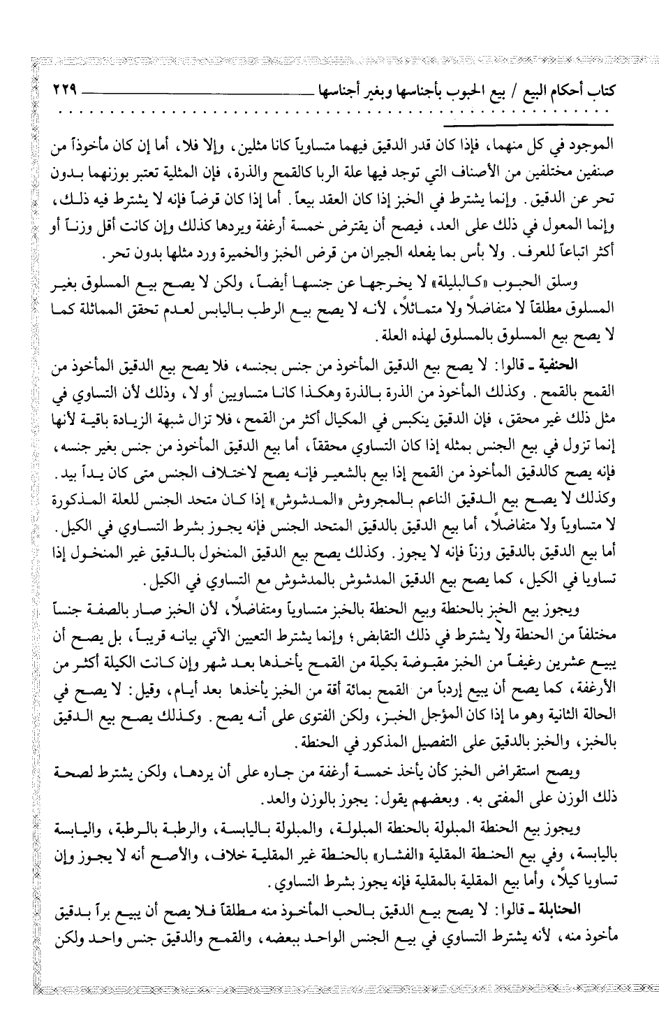 الحنفية - قالوا: لا يصح بيع الدقيق المأخوذ من جنس بجنسه، فلا يصح بيع الدقيق المأخوذ من القمح بالقمح. وكذلك المأخوذ من الذرة بالذرة وهكذا كانا متساويين أو لا، وذلك لأن التساوي في مثل ذلك غير محقق، فإن الدقيق ينكبس في المكيال أكثر من القمح، فلا تزال شبهة الزيادة باقية لأنها إنما تزول في بيع الجنس بمثله إذا كان التساوي محققاً، أما بيع الدقيق المأخوذ من جنس بغير جنسه، فإن يصح كالدقيق المأخوذ من القمح إذا بيع بالشعير فإنه يصح لاختلاف الجنس متى كان يداً بيد. وكذلك لا يصح بيع الدقيق الناعم بالمجروش "المدشوش" إذا كان متحد الجنس للعلة المذكورة لا متساوياً ولا متفاضلاً، أما بيع الدقيق بالدقيق المتحد الجنس فإنه يجوز بشرط التساوي في الكيل. أما بيع الدقيق بالدقيق وزناً فإنه لا يجوز. وكذلك يصح بيع الدقيق المنخول بالدقيق غير المنخول إذا تساويا في الكيل، كما يصح بيع المدشوش مع التساوي في الكيل.