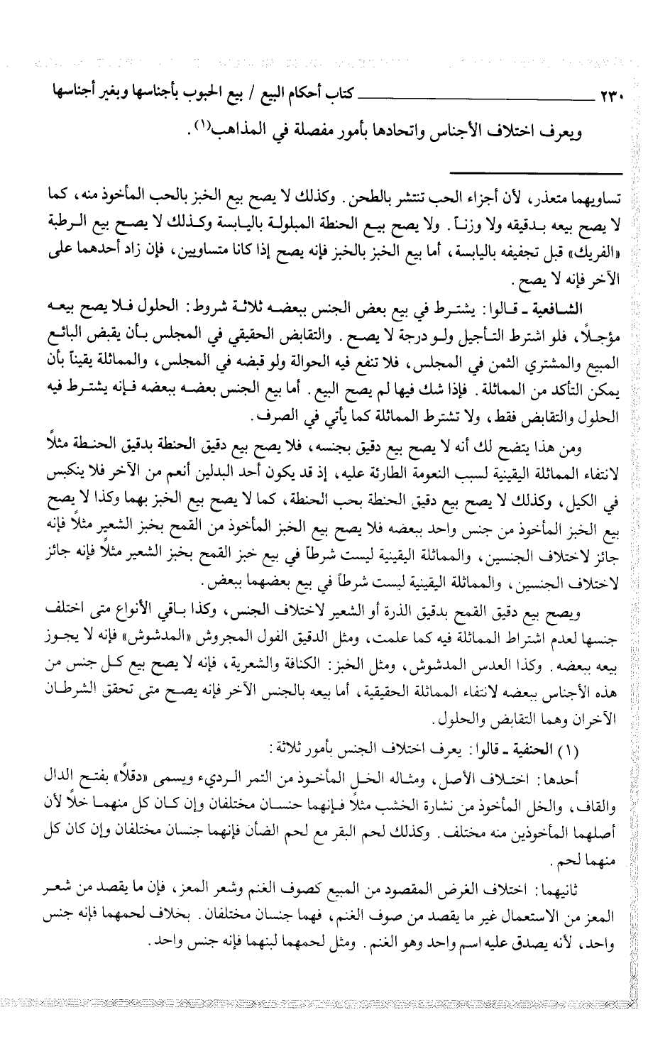 ثانيهما: اختلاف الغرض المقصود من المبيع كصوف الغنم وشعر المعز، فإن ما يقصد من شعر المعز من الاستعمال غير ما يقصد من صوف الغنم، فهما جنسان مختلفان. بخلاف لحمهما فإنه جنس واحد، لأنه يصدق عليه اسم واحد وهو الغنم. ومثل لحمهما لبنهما فإنه جنس واحد.