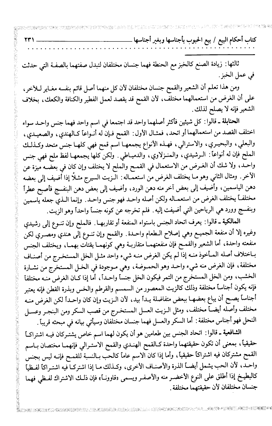 الحنابلة - قالوا: كل شيئين فأكثر أصلهما واحد قد اجتمعا في اسم واحد فهما جنس واحد سواء اختلف القصد من استعمالهما أو اتحد، فمثال الأول: القمح فإن له أنواعاً كالهندس، والصعيدي، والبعلي، والبحيري، والاسترالي، فهذه الأنواع يجمعها اسم قمح فهي كلها جنس متحد وكذلك الملح فإن له أنواعاً: الرشيدي، والمنزلاوي، والدمياطي. ولكن كلها يجمعها لفظ ملح فهي جنس واحد، ولا شك أن الغرض من الاستعمال في القمح والملح لا يختلف وإن كان في بعضه ميزة عن الآخر. ومثال الثاني وهو ما يختلف الغرض من استعماله: الزيت السيرج مثلا إذا أضيف إلى بعضه دهن الياسمين، وأضيف إلى بعض آخر منه دهن الورد، وأضيف إلى بعض دهن البنفسح فأصبح عطراً مختلفاً يختلف الغرض من استعماله ولكن أصله واحد فهو جنس واحد. وإنما الذي جعله ياسمين وبنفسج وورد هي الرياحين التي أضيفت إليه. فلم تخرجه عن كونه جنساً واحداً وهو الزيت.
