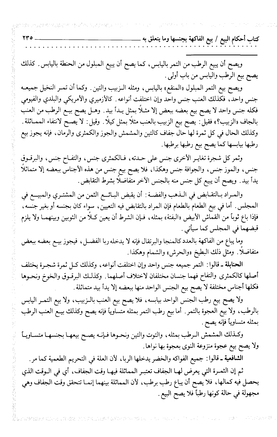 ويصح بيع التمر المبلول "المنقع" باليابس، ومثله بالزبيب والتين. وكما أن تمر النخيل جميعه جنس واحد، فكذلك العنب جنس واحد وإن اختلفت أنواعه. كالأزميري والأمريكي والبلدي والفيومي فكله جنس واحد لا يصح بيع بعضه ببعض إلا مثلاً بمثل يداً بيد. وهل يصح بيع الرطب من العنب بالجاف "الزبيب؟ " فقيل: يصح بيع الزبيب بالعنب مثلاً بمثل كيلاً. وقيل: لا يصح لانتفاء المماثلة. وكذلك الحال في كل ثمرة لها حال جفاف كالتين والمشمش والجوز والكمثرى والرمان، فإنه يجوز بيع رطبها بيابسها كما يصح بيع رطبها برطبها.
