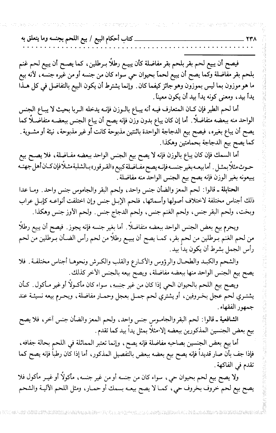 ويحرم بيع بعض الجنس الواحد ببعضه متفاضلاً. أما بغير جنسه فإنه يجوز. فيصح أن يبيع رطلاً من لحم الغنم برطلين من لحم بقر، كما يصح أن يبيع رطلاً من لحم رأس الضأن برطلين من لحم رأس الجمل بشرط أن يكون يداً بيد.