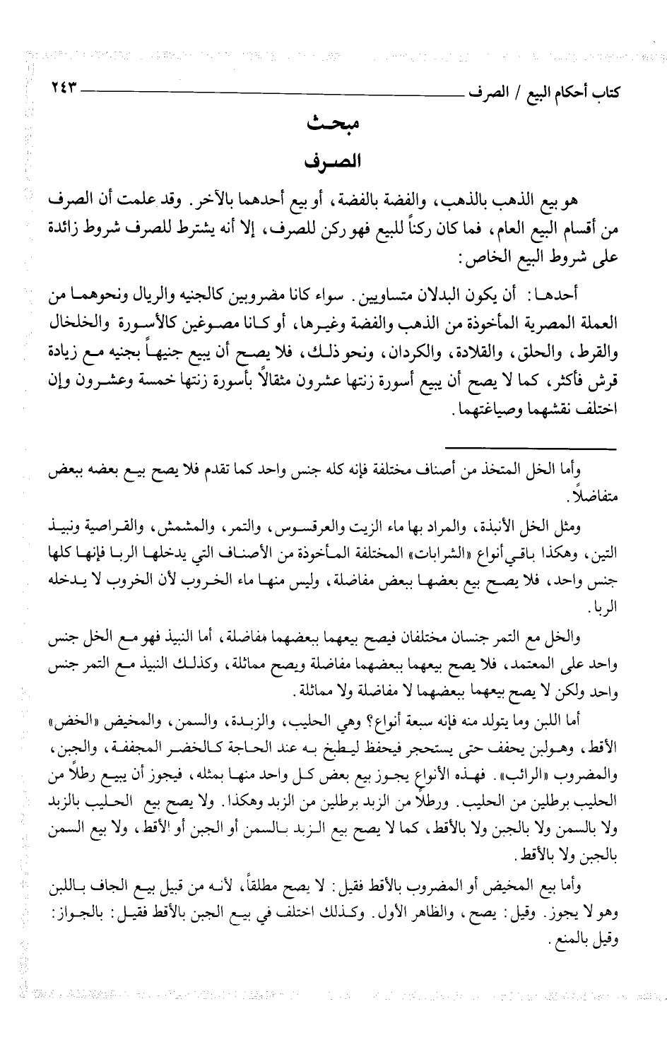 أحدها: أن يكون البدلان متساويين. سواء كانا مضروبين كالجنيه والريال ونحوهما من العملة المصرية المأخوذة من الذهب والفضة وغيرها، أو كانا مصوغين كالأسورة والخلخال والقرط، والحلق، والقلادة، والكردان، ونحو ذلك، فلا يصح أن يبيع جنيهاً بجنيه مع زيادة قرش فأكثر، كما لا يصح أن يبيع أسورة زنتها عشرون مثقالاً بأسورة زنتها خمسة وعشرون وإن اختلف نقشهما وصياغتهما.